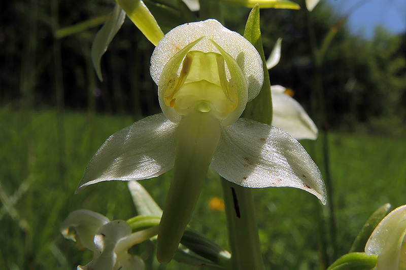 Eine Blüte des Grünlichen Breitkölbchens, aus der Nähe betrachtet. Im Unterschied zur Zweiblättrigen Waldhyazinthe (Platanthera bifolia) stehen bei dieser Art die Staubbeutelfächer weit auseinander. Informationen zur Pflanze: Art: Grünliches Breitkölbchen (Platanthera chlorantha). Verbreitung: Nordwärts bis ins südliche Skandinavien, Island und Grossbritannien, südwärts bis Nordspanien, Sizilien und Peleponnes. Ostwärts erstrecken sich die Vorkommen über Westasien, China bis nach Korea und Japan. Regionale Verbreitung Alpen: In Höhen bis 1800 m, zerstreut. Vorkommen: Basenreiche, häufig wechselfeuchte, kalkhaltige Böden - lichte Laub- und Nadelwälder, Gebüschzonen, Waldränder, Mager- und Feuchtwiesen. Wuchshöhe: 20 - 60 cm. Blüte: Mitte Mai - Juli, obere Sepalen (äussere Blütenblätter, Kelchblätter) 5 - 7 mm lang und 5 - 6 mm breit, seitliche Sepalen (äussere Blütenblätter, Kelchblätter) 7,5 - 8 mm lang und 4 - 4,5 mm breit, Petalen (innere Blütenblätter, Kronblätter) 5 - 6 mm lang und 2,5 - 3 mm breit, Lippe 8 - 13 mm lang und 2 mm breit. |
