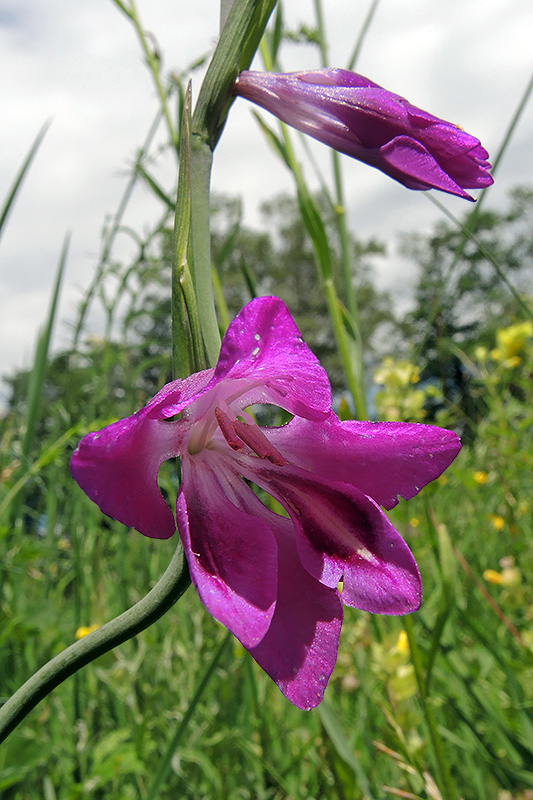In den einseitswendigen Blütenständen der Sumpf-Gladiole stehen meist zwei bis sechs Blüten. Informationen zur Pflanze: Art: Sumpf-Gladiole (Gladiolus palustris). Verbreitung: Mittel- und südosteuropäisch, von Ostfrankreich über Österreich und Italien bis nach Bulgarien. Vereinzelte Vorkommen findet man in Polen, Weissrussland, Russland und Litauen. Regionale Verbreitung Alpen: In Höhen bis 1500 m, selten. Vorkommen: Wechselfeuchte, eher nährstoffarme, aber basenreiche und humose Böden - feuchte Wiesen, Streuwiesen, aber auch Halbtrockenrasen und Kalk-Trockenkiefernwälder. Wuchshöhe: 30 - 60 cm. Blüte: Mitte Juni - Juli, Länge Perigonblätter bis 3 cm. |