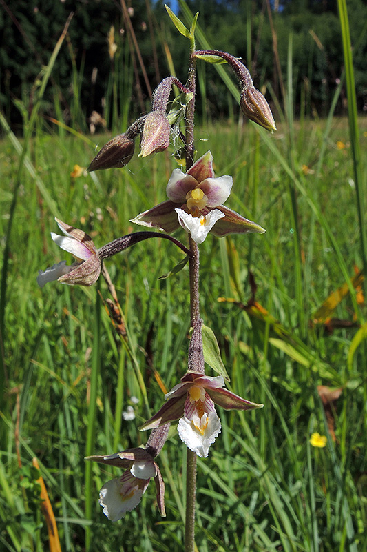 Hunderte von Pflanzen wachsen im Moor. Informationen zur Pflanze: Art: Sumpf-Stendelwurz (Epipactis palustris). Verbreitung: Temperate und submeridionale Florenzone Europas bis Sibirien, Kaukasien und Westen des Irans. Nordwärts reicht die Verbreitung bis Südskandinavien, südwärts bis Italien, Griechenland und Anatolien. In Nordamerika verwildert. Regionale Verbreitung Alpen: In Höhen bis 1500 m, selten. Im Voralpengebiet und in den tieferen Lagen der Alpen zerstreut. Vorkommen: Kalk- oder basenreiche, stickstoffarme, sickerfeuchte oder zumindest zeitweise staunasse, feinkörnige und humusreiche Böden - nasse Dünentäler, Pfeifengraswiesen, Quell- und Niedermoore, sickernasse Hänge, Seeufer, wechselfeuchte Mulden in Flussauen, lichte Kiefern- und Pappelwälder. Wuchshöhe: 20 - 50 cm. Blüte: Juni - August, Sepalen (äussere Blütenblätter, Kelchblätter), oberes 8 - 12 mm lang, 3,5 - 4 mm breit, seitliche etwas länger. Petalen (innere Blütenblätter, Kronblätter) 8 - 11 mm lang, 4 mm breit, Lippe (Labellum) 9 - 13 mm lang. |