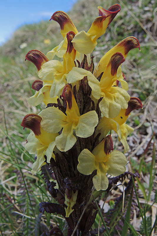 Das Bunte Läusekraut ist auf frischen, lehmigen und mehr oder weniger basischen Magerrasen zu finden. Informationen zur Pflanze: Art: Buntes Läusekraut (Pedicularis oederi). Verbreitung: Arktisch-alpin, asiatisch sowie nordamerikanisch. Regionale Verbreitung Alpen: Kalkketten vom Schweizer Jura bis zum Alpenostrand, in Höhen zwischen 1500 und 2500 m, selten. Vorkommen: Kalkhaltige, feuchte Lehmböden - feuchte, steinige Rasen, Matten, Zwergstrauchheiden. Wuchshöhe: 5 - 10 cm. Blüte: Juni - August. |