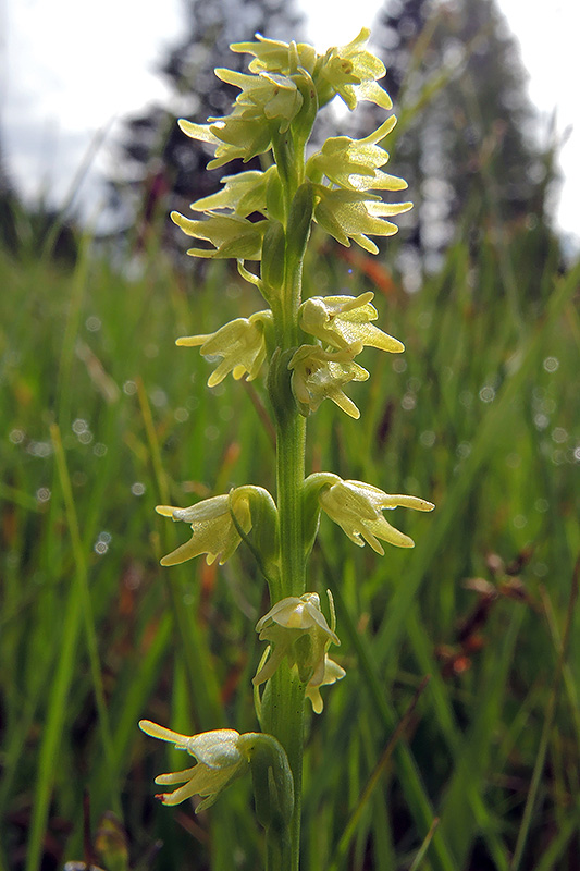 Die kleinen, glockenförmigen Blüten verströmen einen an Honig erinnernden Duft. Informationen zur Pflanze: Art: Einorchis (Herminium monorchis). Verbreitung: Temperat-boreale Zone von Europa ostwärts über Kaukasien, Japan und China bis zum Himalaya. Regionale Verbreitung Alpen: Im Norden bis in Höhen von 1400 m, im Süden bis 1800 m, zerstreut. Vorkommen: Wechselfeuchte, basische bis kalkreiche, humose Böden - Kalkflachmoore, Feuchtwiesen, kurzrasige Halbtrockenrasen, Moorwiesen, nährstoffarme Moore und Moorwälder. Wuchshöhe: 7 - 30 cm. Blüte: Juni - Mitte August, Länge Blüte 3 - 8 mm. |