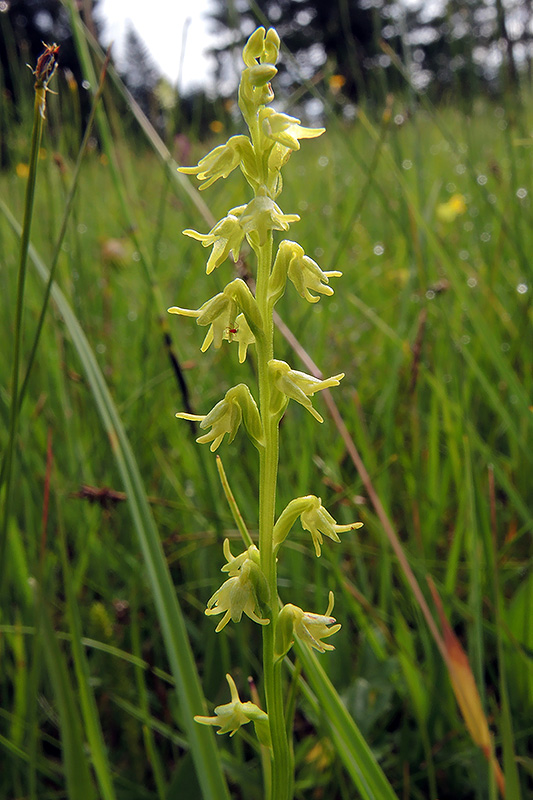 Die Einorchis ist aufgrund ihrer Empfindlichkeit auf Eutrophierung durch zuviel oder zu wenig Beweidung, Torfabbau, Entwässerung, Düngung, Verbuschung und Aufforstung im Rückgang begriffen und in vielen Gebieten stark gefährdet oder verschwunden. Informationen zur Pflanze: Art: Einorchis (Herminium monorchis). Verbreitung: Temperat-boreale Zone von Europa ostwärts über Kaukasien, Japan und China bis zum Himalaya. Regionale Verbreitung Alpen: Im Norden bis in Höhen von 1400 m, im Süden bis 1800 m, zerstreut. Vorkommen: Wechselfeuchte, basische bis kalkreiche, humose Böden - Kalkflachmoore, Feuchtwiesen, kurzrasige Halbtrockenrasen, Moorwiesen, nährstoffarme Moore und Moorwälder. Wuchshöhe: 7 - 30 cm. Blüte: Juni - Mitte August, Länge Blüte 3 - 8 mm. |