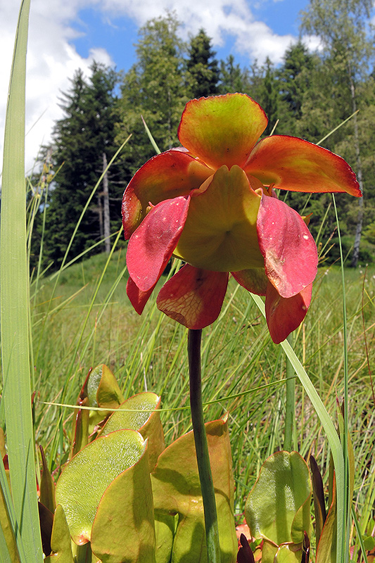 Die Blüte der Krugpflanze ist gelbgrün bis rot, nickend, kugelig und besteht aus je 5 Kelch- und Kronblättern. Informationen zur Pflanze: Art: Krugpflanze (Sarracenia purpurea). Verbreitung: Nordamerika, von Kanada bis Florida. In Europa an passenden Standorten angesalbt, so im Schweizer Jura, in Deutschland in Mittelfranken, in der Lausitz, in Nordrhein-Westfalen und im Bayerischen Wald, in Irland, England und Schweden. Regionale Verbreitung Alpen: Montan. Vorkommen: Moore. Wuchshöhe: 20 - 60 cm. Blüte: Juli, Durchmesser Blüte 3 - 4 cm. |
