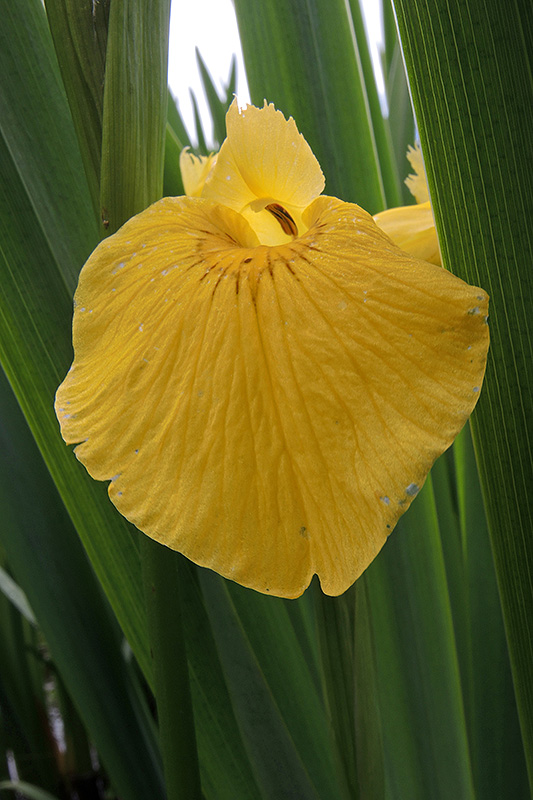 Zwischen den langen und bis 3 cm breiten Laubblättern drängt sich eine Blüte in den Vordergrund. Informationen zur Pflanze: Art: Gelbe Schwertlilie (Iris pseudacorus). Verbreitung: Grosse Teile des westlichen Eurasiens. In Nordamerika eingeschleppt. Regionale Verbreitung Alpen: In den Nordalpen nur im Randsaum, in den Südalpen bis in Höhen von 700 m, selten. Vorkommen: Bevorzugt schwere Lehmböden - Ufer, Röhricht, Gräben, Sümpfe, Riedgrasbestände, Niedermoore, Bruchwälder. Wuchshöhe: 50 - 100 cm. Blüte: Ende Mai - Juni, äussere Perigonblätter Länge 4 – 8 cm, Breite bis über 3 cm, innere Perigonblätter Länge 2 - 3 cm, Breite 4 - 8 mm. |