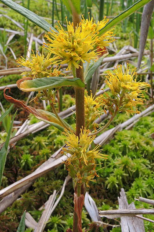 Die Blütenstände befinden sich in den Achseln der mittleren Laubblätter. Informationen zur Pflanze: Art: Strauss-Gilbweiderich (Lysimachia thyrsiflora). Verbreitung: Europäisch-nordamerikanisch, weite Teile der borealen und der gemässigten Zone der Nordhalbkugel. Regionale Verbreitung Alpen: Dringt am Alpenrand örtlich in die Täler vor, selten und gebietsweise fehlend. Vorkommen: Torfige oder schlammig-tonige, zeitweise überschemmte Böden - Moore, Sümpfe, Ufer, Gräben, feuchte Wiesen, feuchte Wälder. Wuchshöhe: 30 - 70 cm. Blüte: Mai - Juli, Länge Blütentraube 1,5 - 2,5 cm. |