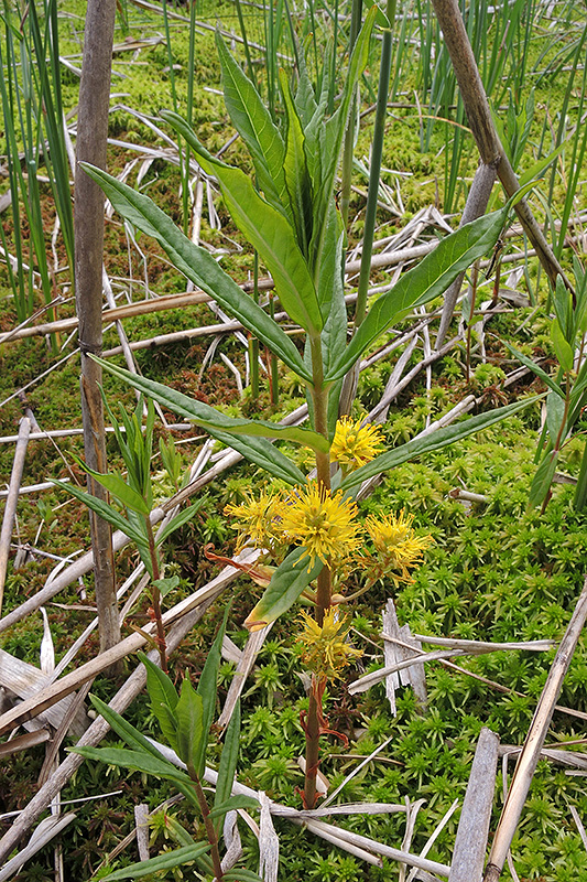 Der Strauss-Gilbweiderich wächst als aufrechte, unverzweigte, ausdauernde, krautige Pflanze. Er gilt in Mitteleuropa als eiszeitliche Reliktpflanze. Informationen zur Pflanze: Art: Strauss-Gilbweiderich (Lysimachia thyrsiflora). Verbreitung: Europäisch-nordamerikanisch, weite Teile der borealen und der gemässigten Zone der Nordhalbkugel. Regionale Verbreitung Alpen: Dringt am Alpenrand örtlich in die Täler vor, selten und gebietsweise fehlend. Vorkommen: Torfige oder schlammig-tonige, zeitweise überschemmte Böden - Moore, Sümpfe, Ufer, Gräben, feuchte Wiesen, feuchte Wälder. Wuchshöhe: 30 - 70 cm. Blüte: Mai - Juli, Länge Blütentraube 1,5 - 2,5 cm. |