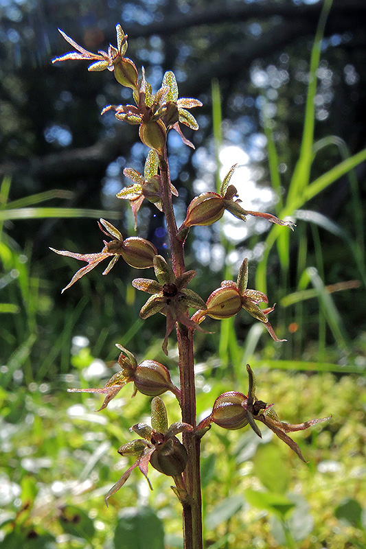 Der Blütenstand des Kleinen Zweiblatts umfasst meist 6 bis 10 Blüten. Informationen zur Pflanze: Art: Kleines Zweiblatt (Neottia cordata, Syn. Listera cordata). Verbreitung: Nördliche Hemissphäre, hauptsächlich in der borealen Zone von Nordamerika über Europa bis Japan. In Europa befinden sich die Hauptvorkommen in Nordeuropa, während sie südlich bis in die Pyrenäen und Gebirge Nordgriechenlands ausstrahlen. Regionale Verbreitung Alpen: In Höhen ab etwa 800 m bis zur Waldgrenze, in den Voralpen und Alpen zerstreut, im Jura sehr selten. Vorkommen: Oberflächlich saure, kalk- und nährstoffarme, rohhumusreiche, feuchte Torfböden - Moospolster der Nadelwälder, Randbereiche von Hochmooren. Wuchshöhe: 5 - 10 cm, selten bis 20 cm. Blüte: Mai - Anfang August, Länge Perigonblätter um 2 mm, Länge Lippe 3 - 4 mm. |