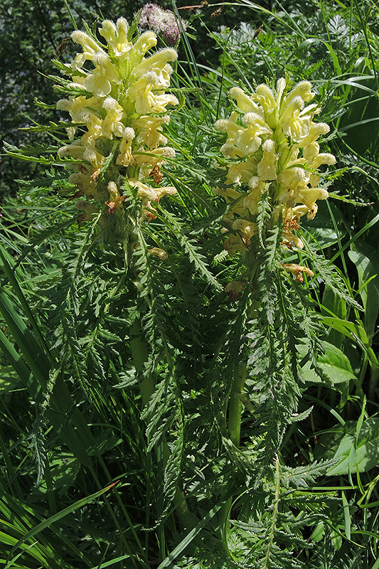 Die mehrjährige, krautige Pflanze hat einen einfachen, behaarten, aufrechten und nur in der oberen Hälfte beblätterten Stengel. Die Blüten stehen in einer dichten Ähre und werden von den Hochblättern überragt. Informationen zur Pflanze: Art: Blattreiches Läusekraut (Pedicularis foliosa). Verbreitung: Mittel- und südeuropäisch. Regionale Verbreitung Alpen: In Höhen von 1000 bis 2400 m. In zentralen Ketten mit kristallinem Gestein vereinzelt, in den Kalkketten von den Seealpen bis zum Schweizer Jura vereinzelt bis selten, weiter ostwärts selten bis zerstreut, im Nordzug gebietsweise fehlend, in den südöstlichen Kalkalpen selten, örtlich zerstreut. Vorkommen: Feuchte, nährstoffreiche, kalkhaltige, steinige Böden - Rasen, Bachränder, Hochstaudenfluren, alpine Zwergstrauchheiden. Wuchshöhe: 20 – 50 cm. Blüte: Juni - August, Länge Krone 2 - 3 cm. |