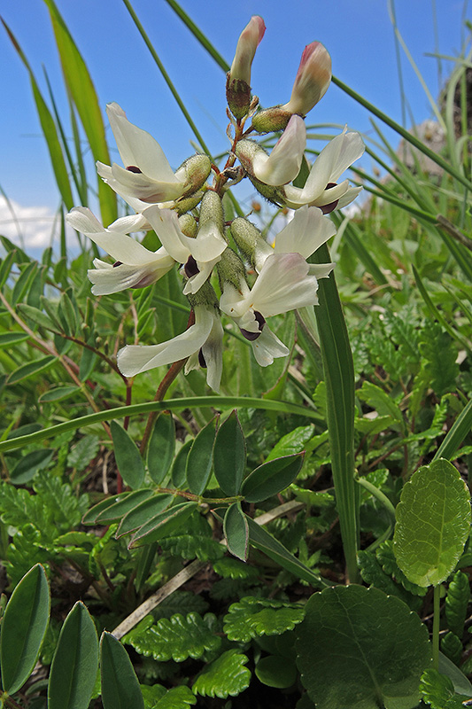 Die Blütenkrone des Südlichen Tragants ist gelblich-weiss mit violetter Schiffchenspitze, zuweilen sind auch die Fahne und die Flügel violett. Informationen zur Pflanze: Art: Südlicher Tragant (Astragalus australis). Verbreitung: Eurosibirisch. Regionale Verbreitung Alpen: Bis in Höhen von 2500 m, in den nördlichen und südlichen Kalkalpen selten, in den Zentralalpen vereinzelt. Vorkommen: Warme, lockere, steinige oder mergelige, etwas kalkhaltige und tonige Böden - schüttere alpine Rasen, Schutthalden, Moränen. Wuchshöhe: 5 - 20 cm. Blüte: Juni - August. |