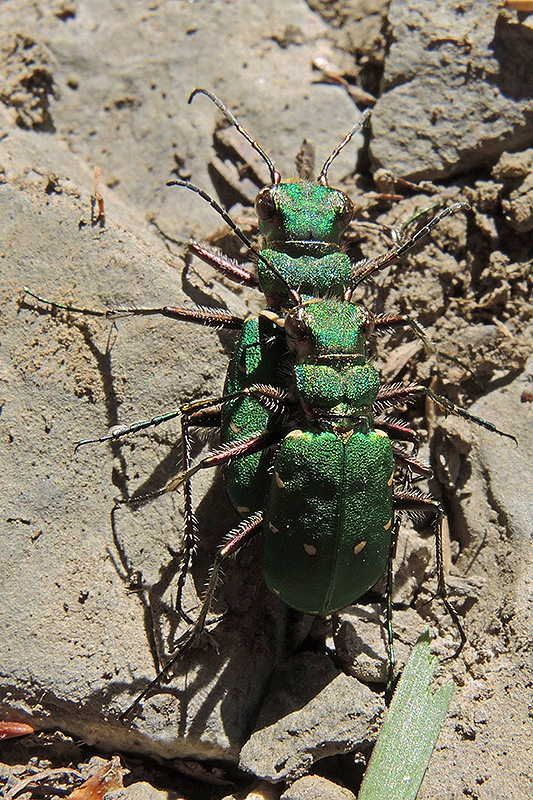Das kleinere Männchen auf dem grösseren Weibchen - zwei Feld-Sandlaufkäfer bei der Paarung. Informationen zum Tier: Art: Feld-Sandlaufkäfer oder Feldsandläufer (Cicindela campestris). Verbreitung: Europa, nördlich bis nach Lappland, Nordafrika, Asien. Regionale Verbreitung Alpen: Bis in subalpine Bereiche. Lebensräume: Sonnige, trockene Gegenden, vor allem mit Sand- und Lehmböden vom Flachland bis ins Gebirge - sonnige und trockene Waldränder, Wege, Heiden, Hochmoore, trockene Wiesen und Trockenhänge, Sandgruben, Sandküsten. Merkmale: Die Käfer weisen eine Länge von 10 - 15 mm auf und sind recht flach gebaut. Ihr Körper ist meist kräftig grün gefärbt, es gibt aber auch blaue und braune Exemplare. Fühler, Bauch und Hinterleib sind leuchtend kupferrot gefärbt. Die langen und schlanken Beine sind im Oberteil von gleicher Farbe, gegen die Tarsen zu werden sie jedoch grün. Auf den Deckflügeln befinden sich je ein gelblichweisser Fleck hinter der Mitte, sowie am Rand drei bis fünf weitere Makel gleicher Farbe. Das Halsschild ist schmaler als der Kopf mit seinen grossen, gewölbten Facettenaugen, den zierlichen Fühlern, der mächtigen weissen bis hellbraunen Oberlippe und den darunterliegenden eindrucksvollen Oberkiefern mit den nadelspitzen Zähnen. Die Deckflügel mit gut ausgebildeten Schultern sind breiter als der Kopf, verlaufen nahezu parallel und enden zusammen in einer flachen Rundung. Lebensweise: Die gut entwickelten, grossen Augen und die langen, schlanken Beine weisen die tagaktiven Tiere als Jäger aus. Mit den Augen sehen sie im Nahbereich sehr gut, so dass auch flüchtige Beute überrascht werden kann. Sie rennen oder fliegen bereits bei der geringsten Störung davon, landen aber meist schon nach wenigen Metern wieder. Für die Jagd bevorzugen sie offene Flächen mit keinem oder spärlichem Pflanzenbewuchs, wo sie sich meist in grösserer Anzahl finden. Während der kalten Jahreszeit ziehen sie sich in frostgeschützte Erdbauten zurück. Nahrung: Sie ernähren sich von Spinnentieren und Insekten aller Art. Deren Aussenskelett durchdringen sie mit ihren spitzen Zähnen ohne Mühe, injizieren ein Verdauungsenzym und saugen sie aus. Paarung: Die Paarungszeit beginnt im Frühjahr nach der Winterruhe. Ei: Die Eier werden an offenen Flächen mit spärlichem Pflanzenbewuchs einzeln in kleine Sandlöcher unmittelbar unter der Oberfläche abgelegt. Larve: Die Larven schlüpfen im Herbst und leben in selbstgegrabenen, senkrechten, etwa 3-4 mm breiten und bis 40 cm tiefen Erdröhren. Sie besitzen einen oben abgeflachten, halbkreisförmigen Kopf und ein ebenso geformtes Halsschild. Bei Gefahr bringen sie sich durch Rückzug nach unten in Sicherheit, sonst sitzen sie direkt an der Öffnung, die sie mit Halsschild und Kopf verschliessen. Sie ernähren sich räuberisch von Ameisen, Spinnen und anderen Käfern. Nähert sich eine Beute auf etwa 4 cm Entfernung, wird sie gepackt und anschliessend ausgesaugt. Die Beine mit den Krallen und ein Höcker mit einem nach vorn gerichteten hornigen Häkchen am fünften Dorsalsegment ermöglichen ihnen eine gute Beweglichkeit im Gang. Puppe: Die Larve lebt meist über mehrere Jahre in ihrem Erdrohr, bis sie sich an deren Grund verpuppt. Die Puppenruhe beträgt ungefähr 4 Wochen. Käfer: Die Käfer schlüpfen im Herbst, bleiben aber meist bis zum nächsten Frühling in ihren Erdröhren. Man findet den Käfer von April bis September. Feinde: Frösche, Kröten, Spitzmäuse, Igel, Fledermäuse, Nagetiere, Singvögel, Spechte, aber auch Parasiten und Parasitoide. |