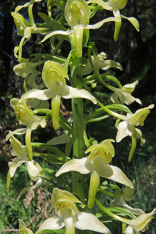 Hauptbestäuber des Grünlichen Breitkölbchens sind Nachtfalter. Angelockt werden sie von einem wachsähnlichen Duft, den die Blüten in der Dämmerung verstärkt bilden. Mit ihren langen Rüsseln sind die Falter in der Lage, den am Spornende befindlichen Nektar zu erreichen. Informationen zur Pflanze: Art: Grünliches Breitkölbchen (Platanthera chlorantha). Verbreitung: Nordwärts bis ins südliche Skandinavien, Island und Grossbritannien, südwärts bis Nordspanien, Sizilien und Peleponnes. Ostwärts erstrecken sich die Vorkommen über Westasien, China bis nach Korea und Japan. Regionale Verbreitung Alpen: In Höhen bis 1800 m, zerstreut. Vorkommen: Basenreiche, häufig wechselfeuchte, kalkhaltige Böden - lichte Laub- und Nadelwälder, Gebüschzonen, Waldränder, Mager- und Feuchtwiesen. Wuchshöhe: 20 - 60 cm. Blüte: Mitte Mai - Juli. |