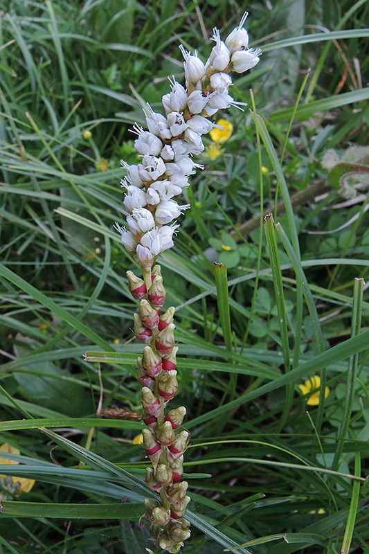 Der ährige und endständige Blütenstand weist eine Dicke von etwa 5 mm auf. Im unteren Teil finden sich Brutknöllchen, im oberen Teil weisse bis rosafarbene Blüten. Informationen zur Pflanze: Art: Knöllchen-Knöterich (Polygonum viviparum). Verbreitung: Arktisch-alpin - Europa, Asien und Nordamerika. Regionale Verbreitung Alpen: In Höhen zwischen 1000 und 3000 m, häufig. Vorkommen: Durchfeuchtete, mineralreiche, kalk- und nährstoffarme Böden - Matten, Weiden, Schneetälchen, Flachmoore. Wuchshöhe: 5 - 25 cm. Blüte: Juni - August, Länge Blüte 2 – 3 mm. |
