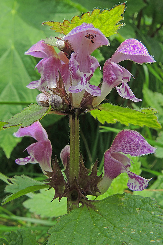 Die Scheinquirle der Gefleckten Taubnessel stehen gewöhnlich in drei bis acht Etagen übereinander. Informationen zur Pflanze: Art: Gefleckte Taubnessel (Lamium maculatum). Verbreitung: Mittel- und Südeuropa, West- und Kleinasien. Regionale Verbreitung Alpen: In Höhen bis 2000 m, verbreitet, gebietsweise fehlend. Vorkommen: Frische bis feuchte, halbschattige Ruderalstellen - Gebüsche, Hecken, Waldsäume, Wegränder, Mauern, Strassengräben, Schuttplätze, frische Edellaubwälder. Wuchshöhe: 20 - 50 cm. Blüte: April - November, Krone 2 – 3 cm lang. |