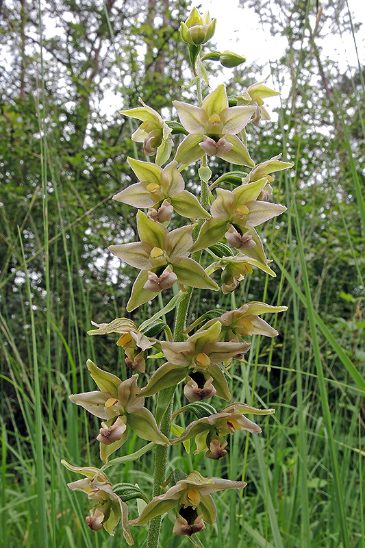 Eine Pflanze mit fast grünlichen, an Müllers Breitblättrige Stendelwurz erinnernden Blüten.