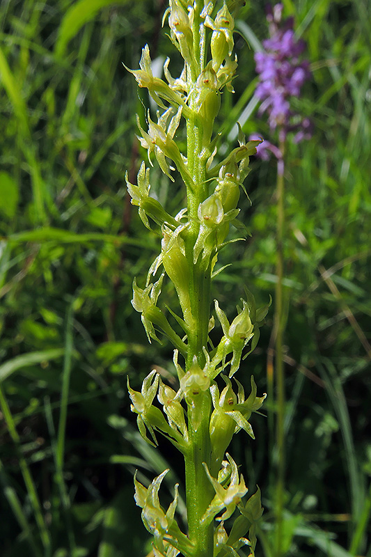 Entlang der Naturstrasse hinaus nach Rauth blüht an einem feuchten Wiesenbord das Einblatt. Die Blüten sind auf Grund des 360° gedrehten Fruchtknotens mit der Lippe nach oben gerichtet. Informationen zur Pflanze: Art: Einblatt (Malaxis monophyllos). Verbreitung: Im zirkumpolaren Areal der temperaten und borealen Zone Europas, Asiens und Nordamerikas. In den Gebirgen Ostasiens und Nordamerikas bis in die meridionale Zone. Das Einblatt fehlt in Westeuropa, südwärts kommt es bis in die Alpen und Karpaten vor. Regionale Verbreitung Alpen: In den Westalpen selten, in den Ostalpen zerstreut, bis in Höhen von 1800 m. Vorkommen: Mässig nährstoff- und mineralreiche, lockere Böden, vorzugsweise mit austretendem Hangdruckwasser - nasse Laubwälder, Feuchtwiesen, feuchte Weg- und Bachränder, Böschungen, moosige Polster von Felsen, Niedermoore, Kalkflachmoore. Wuchshöhe: 10 - 30 cm. Blüte: Juni - Juli, Länge Perigonblätter 1,5 – 2,5 mm. |