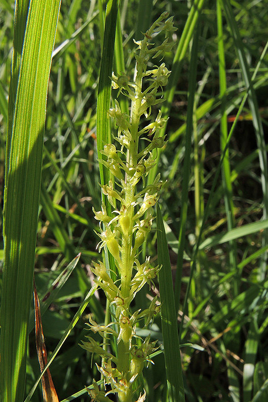Der Blütenstand erreicht eine Länge von bis zu 15 cm und kann mit bis zu 100 kleinen, unscheinbar blassgelben bis hellgrünlichen Blüten besetzt sein. Damit dürfte das Einblatt die heimische Orchidee mit den meisten Blüten sein. Informationen zur Pflanze: Art: Einblatt (Malaxis monophyllos). Verbreitung: Im zirkumpolaren Areal der temperaten und borealen Zone Europas, Asiens und Nordamerikas. In den Gebirgen Ostasiens und Nordamerikas bis in die meridionale Zone. Das Einblatt fehlt in Westeuropa, südwärts kommt es bis in die Alpen und Karpaten vor. Regionale Verbreitung Alpen: In den Westalpen selten, in den Ostalpen zerstreut, bis in Höhen von 1800 m. Vorkommen: Mässig nährstoff- und mineralreiche, lockere Böden, vorzugsweise mit austretendem Hangdruckwasser - nasse Laubwälder, Feuchtwiesen, feuchte Weg- und Bachränder, Böschungen, moosige Polster von Felsen, Niedermoore, Kalkflachmoore. Wuchshöhe: 10 - 30 cm. Blüte: Juni - Juli, Länge Perigonblätter 1,5 – 2,5 mm. |
