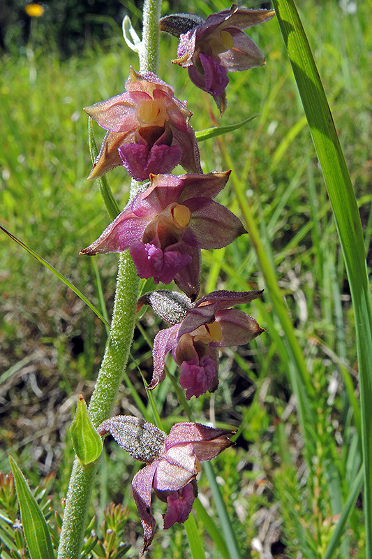 In der Umgebung der Höflishütte blüht die Braunrote Stendelwurz. Deren Stengel und Fruchtknoten sind stark behaart. Informationen zur Pflanze: Art: Braunrote Stendelwurz (Epipactis atrorubens). Verbreitung: In Europa weit verbreitet, im Norden bis an die boreale, im Süden an die meridionale Zone, Richtung Osten bis Zentralsibirien und zum Kaukasus. Regionale Verbreitung Alpen: In Höhen bis 2600 m, zerstreut. Vorkommen: Kalkreiche, basisch bis neutrale, nährstoffarme, durchlässige, trockenwarme Sand- und Steinböden - helle Misch- und Nadelwälder, Säume, lichte Gebüsche, Brachland, Bahndämme, Halden, Zwergstrauchheiden von Dünen. Wuchshöhe: 20 - 80 cm. Blüte: Juni - August, Sepalen (äussere Blütenblätter, Kelchblätter) Länge 8 - 10 mm, Breite 3,5 - 5 mm, Petalen (innere Blütenblätter, Kronblätter) etwas kürzer und breiter, Hypochil (hinterer Teil der zweigliedrigen Lippe) Länge 4 - 6 mm. |