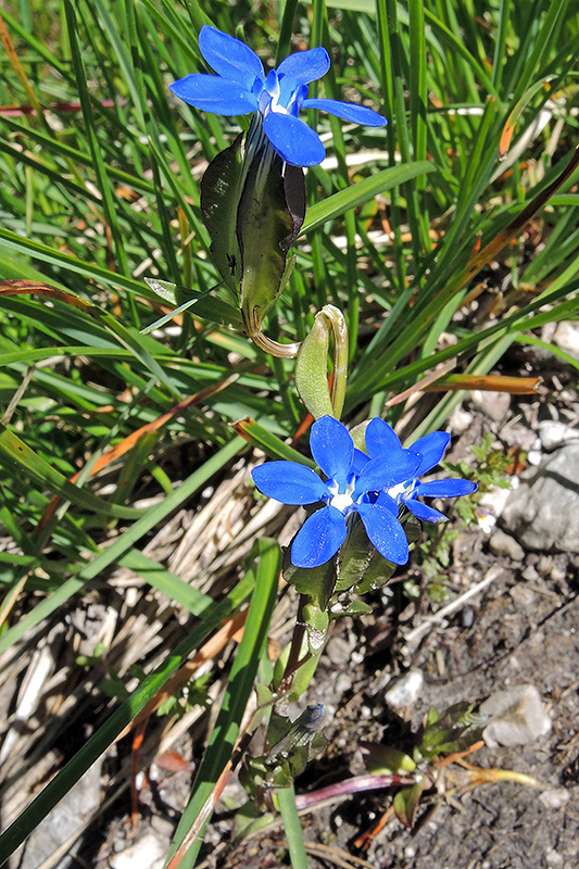 Am von Wasser überrieselten Pfad blühen wenige Exemplare des Aufgeblasenen Enzians. Informationen zur Pflanze: Art: Aufgeblasener Enzian (Gentiana utriculosa). Verbreitung: Berge Mitteleuropas, Italiens und der Balkanhalbinsel. Regionale Verbreitung Alpen: In Höhen zwischen 500 und 2500 m, in Ketten mit Kalk selten, in Ketten mit kristallinem Gestein vereinzelt. Vorkommen: Nass-feuchte, kalkreiche, modrig-humose Ton-, Kalktuff- oder Moorböden - frische bis feuchte Wiesen und Weiderasen, lichte Wälder, Flachmoore. Wuchshöhe: 5 - 20 cm. Blüte: Mai - August, Länge Röhre 1,5 – 2,5 cm. |