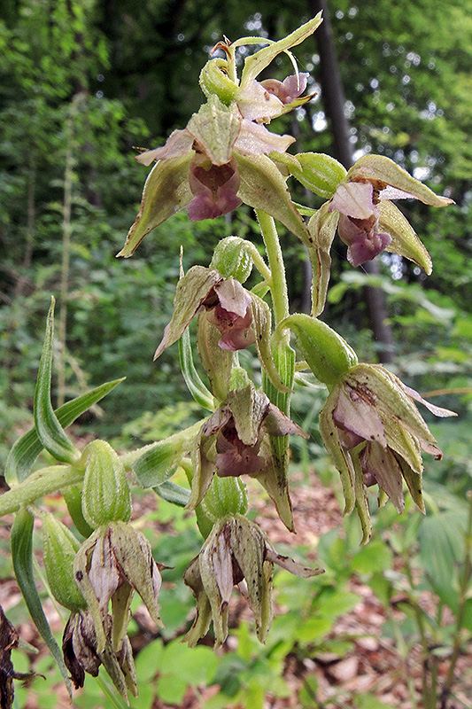 Einige nahezu verblühte Exemplare wachsen am südseitigen Hang im Schatten einer Baumgruppe. Informationen zur Pflanze: Art: Übersehene Stendelwurz (Epipactis leptochila subsp. neglecta, Syn. Epipactis neglecta). Verbreitung: Mittel- und Süddeutschland, England, Belgien, Frankreich, Schweiz, Österreich, Ungarn Tschechien, Slowakei, Kroatien, Slowenien, Italien, ostwärts bis Georgien. Regionale Verbreitung Alpen: Nur im nördlichen Vorland, in Höhen bis 1400 m, selten. Vorkommen: Kalkhaltige, lockere Böden - unterholz- und krautarme Buchen- und Laubmischwälder. Wuchshöhe: 20 - 70 cm. Blüte: Mitte bis Ende Juli. |