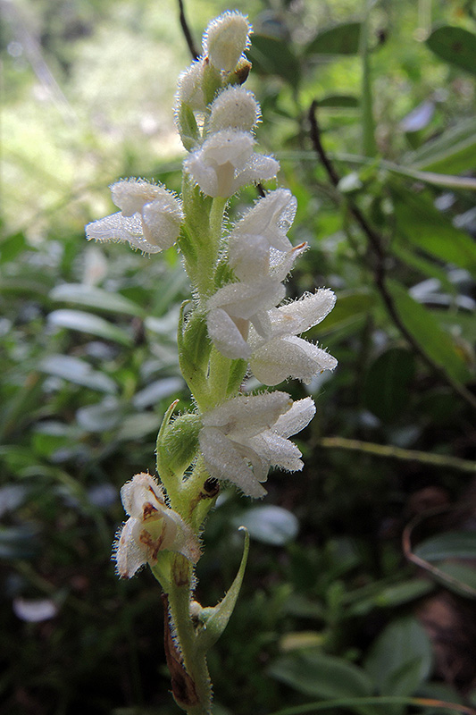 Der schlanke, einseitswendige Blütenstand der Moosorchis trägt 10 – 15 Blüten. Informationen zur Pflanze: Art: Moosorchis (Goodyera repens). Verbreitung: Europa mit Ausnahme der mediterranen Gebiete, Kaukasien, Zentralasien, Himalaya, ostasiatische Gebirge, boreale Zone und Gebirge Nordamerikas. Regionale Verbreitung Alpen: In Höhen bis 2000 m, zerstreut. Vorkommen: Halbschattige, moosige, basische bis saure, nährstoffarme Nadelstreu-Rohhumusböden - Nadelwälder, Mischwälder. Wuchshöhe: 5 - 25 cm. Blüte: Mitte Juni - Ende August, Länge Lippe und Perigonblätter 4 mm. |
