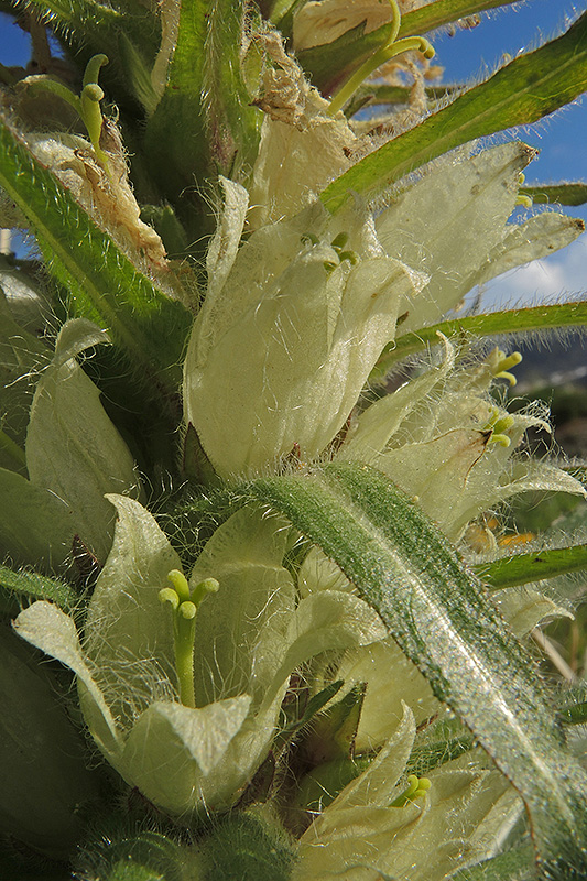 Ein Detailausschnitt des Blütenstandes. Informationen zur Pflanze: Art: Straussblütige Glockenblume (Campanula thyrsoides). Verbreitung: Mittel- und südosteuropäisch - Alpen, Jura und Balkan. Regionale Verbreitung Alpen: In Höhen zwischen 1000 und 2700 m, in den nördlichen Kalkketten selten, in den südlichen Kalkketten zerstreut, örtlich selten, in den zentralen Ketten vereinzelt. Vorkommen: Nährstoffreiche, feuchte, sonnige, steinige, gut durchlüftete, kalkhaltige Böden - Matten, Bergwiesen, Wildheuplanken, Felsbänder, Geröll. Wuchshöhe: 10 – 50 cm. Blüte: Juni - August, Länge Blüte 2 cm. |
