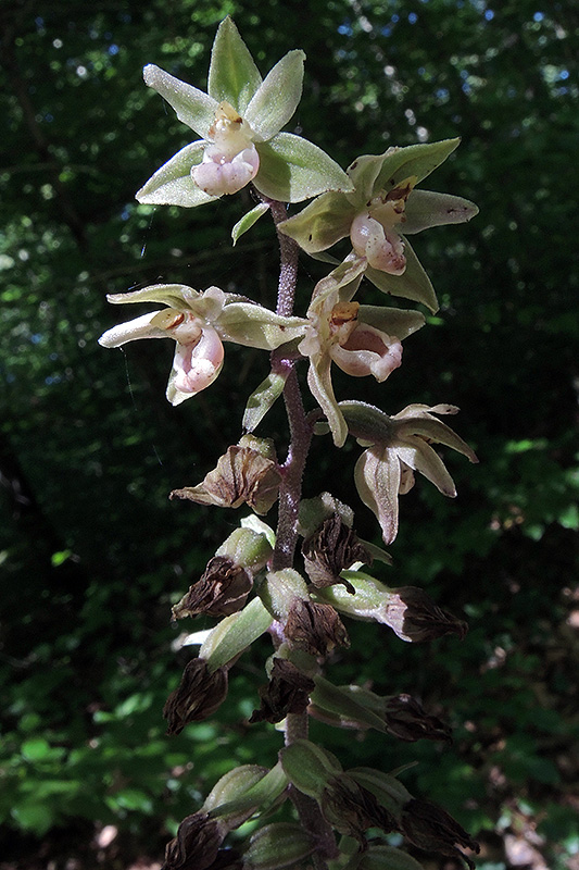 Es dauert runde dreieinhalb Wochen, bis ich wieder dazu komme, den Standort aufzusuchen. Der Grossteil der Blüten ist bereits verwelkt, nur an der Spitze zeigen sich noch wenige, frische Blüten. Informationen zur Pflanze: Art: Violette Stendelwurz (Epipactis purpurata). Verbreitung: Europäisch, nordwärts bis Südengland, Dänemark und das nordöstliche Polen, ostwärts bis Rumänien, südwärts von Nordspanien über Süditalien bis ins nordwestliche Griechenland. Regionale Verbreitung Alpen: In den Westalpen nur im nördlichen Vorland und Jura, in Höhen bis 1500 m, verbreitet, stellenweise häufig. In den Ostalpen vom Tirol ostwärts, selten. Vorkommen: Kalkhaltige, tiefgründige, frische bis nicht allzu feuchte Böden - schattige Laubmischwälder, seltener in Fichtenmonokulturen. Wuchshöhe: 20 - 80 cm. Blüte: Ende Juli - Ende August. |