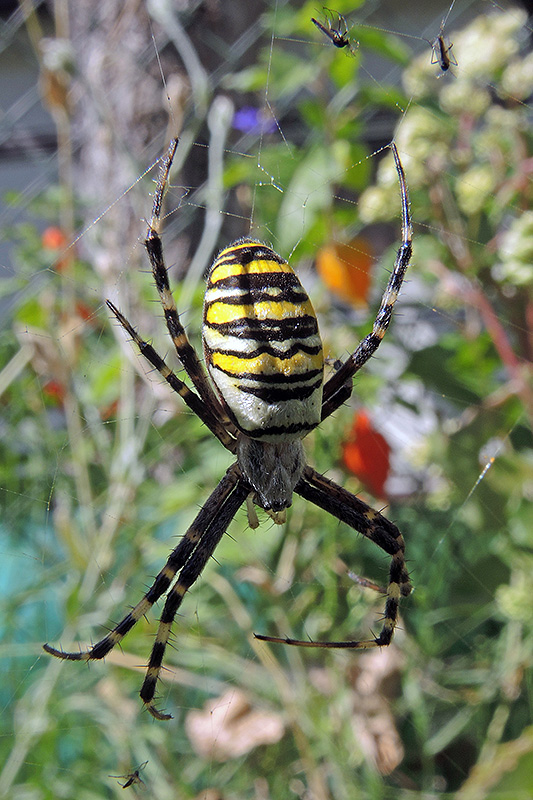 Die Wespenspinne zählt zweifellos zu den attraktivsten einheimischen Spinnen. Informationen zum Tier: Art: Wespenspinne, Zebraspinne, Tigerspinne oder Seidenbandspinne (Argiope bruennichi). Verbreitung: Ursprünglich im südlichen Europa, in Mitteleuropa sehr selten. Mittlerweile ist sie in fast allen europäischen sowie in einigen asiatischen und nordafrikanischen Ländern anzutreffen. Regionale Verbreitung Alpen: Bis in Höhen um 1000 m. Lebensräume: Sonnige, offene Standorte mit niedriger bis halbhoher Vegetation und hoher Heuschrecken-Population auf trockenem wie feuchtem Untergrund - Trockenrasen, lückig bewachsenes Ödland, Feuchtwiesen. In optimalen Lebensräumen kommen die Wespenspinnen in grosser Dichte vor. Merkmale: Während Männchen nur eine Körperlänge von 6 mm erreichen, werden Weibchen mit bis zu 25 mm deutlich grösser. Unverwechselbar ist bei den Weibchen der gelb-weiss gestreifte, mit schwarzen Querbändern wespenähnlich gezeichnete Hinterleib und der silbrig-weiss behaarte Vorderleib. Auch die Beine weisen schwarze Querstreifen auf, allerdings ist dort das Gelb eher blass, fast hellbraun oder beige. Die hellbraunen Männchen mit undeutlicher dunkler Zeichnung sind wesentlich unauffälliger. Lebensweise: Die Wespenspinne lebt in einem Radnetz, für dessen Erstellung sie etwa 40 Minuten benötigt. Die Höhe der Netznabe liegt angepasst an den Lebensraum der Beutetiere üblicherweise zwischen 20 und 70 cm über dem Boden. Charakteristisch für das Netz ist ein häufig sehr kräftiges, zickzackförmiges Gespinstband in vertikaler Ausrichtung ober- und unterhalb der Nabe, das sogenannte Stabiliment. Männchen fertigen häufig kein eigenes Spinnennetz. Es kommt sogar vor, dass sie Weibchen aus deren Netzen vertreiben. Nahrung: Heuschrecken, Bienen und Wespen, aber auch andere Insekten geeigneter Grösse wie Fliegen, Schmetterlinge, Libellen oder Heupferde. Sobald sich Beute im Netz verfangen hat, wird das Opfer eingewickelt und mit für den Menschen ungefährlichem Gift getötet. Die Weichteile der Beute werden dabei verflüssigt und danach ausgesaugt. Wespenspinnen haben mit ihren enormen Vertilgungsraten in einem natürlichen System eine überaus grosse Bedeutung bei der Limitierung der Populationsdichten von Insekten. Eine Untersuchung nahe Jena in Deutschland hat ergeben, dass alleine die Wespenspinnen pro Hektare Wiese rund 4,5 Mio. Arthropoden pro Jahr vertilgen, was rund 80 kg Frischmasse entspricht. Paarung: Die Paarung vollzieht sich Ende Juli bis Anfang August. Die Männchen rütteln am Netz des Weibchens und erregen es dadurch. Nachdem sich das Weibchen erhoben hat, kriecht das Männchen darunter und begattet es. Die Weibchen sind extrem kannibalistisch veranlagt und versuchen unmittelbar nach Beginn der Paarung, das Männchen zu erbeuten, was meist auch gelingt. Ei: Etwa einen Monat nach der Paarung legt das Weibchen innert weniger Minuten gegen 400 Eier mit einem Durchmesser von 5 mm in kugelförmige, bräunliche Kokons. Jungtiere: Noch vor Wintereinbruch schlüpfen die Spinnen aus ihren Eiern und ernähren sich innerhalb des Kokons von Eidotter. Sie überdauern den Winter in ihrem schützenden Kokon, ohne weiter Nahrung zu sich zu nehmen. Ab Mai verlassen sie den Kokon und entwickeln sich unter bis zu zehnmaliger Häutung innerhalb von 2 Monaten zu erwachsenen Spinnen. Lebenserwartung: Ab Mai sind junge Spinnen anzutreffen, von Juli bis August findet man erwachsene Tiere, Weibchen kann man bis in den Oktober finden. Feinde: Singvögel, Wespen, Schlupfwespen. |