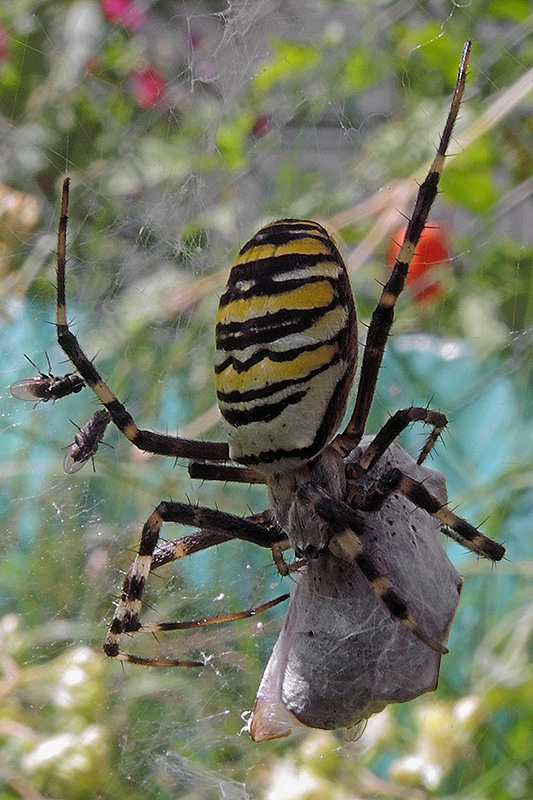 Sobald sich Beute im Netz der Wespenspinne verfangen hat, geht alles sehr schnell. Die Wespenspinne beisst ihr Opfer. Dabei wird Gift verströmt, welches die Beute lähmt und schliesslich auch tötet. Dann wird die Beute fein säuberlich eingesponnen und mit einem Spannfaden am Netz befestigt. Wenn die Wespenspinne Hunger verspürt, holt sie sich ein verpacktes Häppchen und saugt es aus. Informationen zum Tier: Art: Wespenspinne, Zebraspinne, Tigerspinne oder Seidenbandspinne (Argiope bruennichi). Verbreitung: Ursprünglich im südlichen Europa, in Mitteleuropa sehr selten. Mittlerweile ist sie in fast allen europäischen sowie in einigen asiatischen und nordafrikanischen Ländern anzutreffen. Regionale Verbreitung Alpen: Bis in Höhen um 1000 m. Lebensräume: Sonnige, offene Standorte mit niedriger bis halbhoher Vegetation und hoher Heuschrecken-Population auf trockenem wie feuchtem Untergrund - Trockenrasen, lückig bewachsenes Ödland, Feuchtwiesen. In optimalen Lebensräumen kommen die Wespenspinnen in grosser Dichte vor. Merkmale: Während Männchen nur eine Körperlänge von 6 mm erreichen, werden Weibchen mit bis zu 25 mm deutlich grösser. Unverwechselbar ist bei den Weibchen der gelb-weiss gestreifte, mit schwarzen Querbändern wespenähnlich gezeichnete Hinterleib und der silbrig-weiss behaarte Vorderleib. Auch die Beine weisen schwarze Querstreifen auf, allerdings ist dort das Gelb eher blass, fast hellbraun oder beige. Die hellbraunen Männchen mit undeutlicher dunkler Zeichnung sind wesentlich unauffälliger. Lebensweise: Die Wespenspinne lebt in einem Radnetz, für dessen Erstellung sie etwa 40 Minuten benötigt. Die Höhe der Netznabe liegt angepasst an den Lebensraum der Beutetiere üblicherweise zwischen 20 und 70 cm über dem Boden. Charakteristisch für das Netz ist ein häufig sehr kräftiges, zickzackförmiges Gespinstband in vertikaler Ausrichtung ober- und unterhalb der Nabe, das sogenannte Stabiliment. Männchen fertigen häufig kein eigenes Spinnennetz. Es kommt sogar vor, dass sie Weibchen aus deren Netzen vertreiben. Nahrung: Heuschrecken, Bienen und Wespen, aber auch andere Insekten geeigneter Grösse wie Fliegen, Schmetterlinge, Libellen oder Heupferde. Sobald sich Beute im Netz verfangen hat, wird das Opfer eingewickelt und mit für den Menschen ungefährlichem Gift getötet. Die Weichteile der Beute werden dabei verflüssigt und danach ausgesaugt. Wespenspinnen haben mit ihren enormen Vertilgungsraten in einem natürlichen System eine überaus grosse Bedeutung bei der Limitierung der Populationsdichten von Insekten. Eine Untersuchung nahe Jena in Deutschland hat ergeben, dass alleine die Wespenspinnen pro Hektare Wiese rund 4,5 Mio. Arthropoden pro Jahr vertilgen, was rund 80 kg Frischmasse entspricht. Paarung: Die Paarung vollzieht sich Ende Juli bis Anfang August. Die Männchen rütteln am Netz des Weibchens und erregen es dadurch. Nachdem sich das Weibchen erhoben hat, kriecht das Männchen darunter und begattet es. Die Weibchen sind extrem kannibalistisch veranlagt und versuchen unmittelbar nach Beginn der Paarung, das Männchen zu erbeuten, was meist auch gelingt. Ei: Etwa einen Monat nach der Paarung legt das Weibchen innert weniger Minuten gegen 400 Eier mit einem Durchmesser von 5 mm in kugelförmige, bräunliche Kokons. Jungtiere: Noch vor Wintereinbruch schlüpfen die Spinnen aus ihren Eiern und ernähren sich innerhalb des Kokons von Eidotter. Sie überdauern den Winter in ihrem schützenden Kokon, ohne weiter Nahrung zu sich zu nehmen. Ab Mai verlassen sie den Kokon und entwickeln sich unter bis zu zehnmaliger Häutung innerhalb von 2 Monaten zu erwachsenen Spinnen. Lebenserwartung: Ab Mai sind junge Spinnen anzutreffen, von Juli bis August findet man erwachsene Tiere, Weibchen kann man bis in den Oktober finden. Feinde: Singvögel, Wespen, Schlupfwespen. |