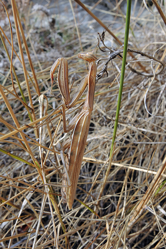 Eine Gottesanbeterin verharrt gut getarnt in der dürren Vegetation. Informationen zum Tier: Art: Europäische Gottesanbeterin (Mantis religiosa). |