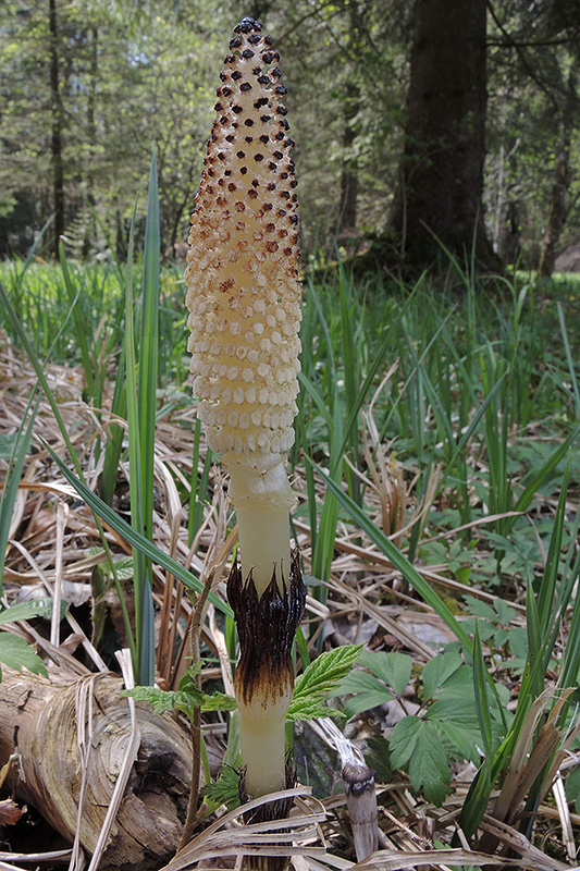 Die blassbraunen, fertilen Stengel sterben nach der Sporenreife ab. Informationen zur Pflanze: Art: Riesen-Schachtelhalm (Equisetum telmateia). Verbreitung: Europa mit Ausnahme von Nord- und Nordosteuropa, Vorderasien, Nordafrika und grosse Teile des westlichen Nordamerikas. Regionale Verbreitung Alpen: In Höhen bis 1300 m. Vorkommen: Kalkhaltige, halbschattige, sickernasse Quellfluren - Laub- und lichte Nadelwälder. Wuchshöhe: Sterile Stengel 40 - 150 cm. Blüte: März - Mai, fertile Stengel 20 – 50 cm hoch, bis 1,5 cm dick. |