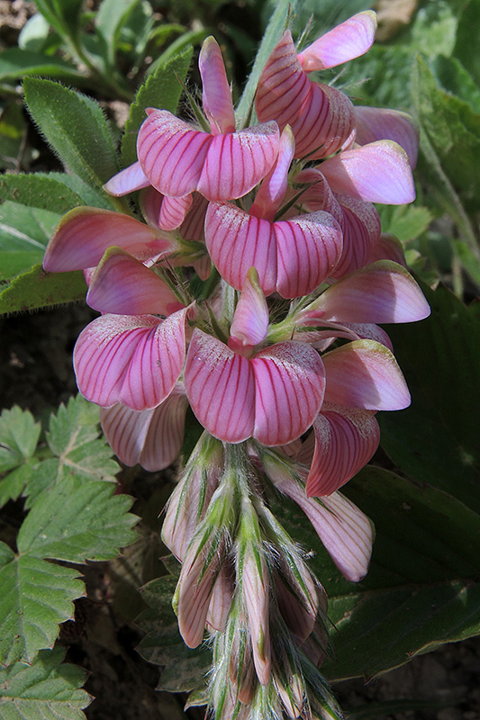 Die Blüte der Saat-Esparsette aus der Nähe gesehen. Informationen zur Pflanze: Art: Saat-Esparsette (Onobrychis viciifolia). Verbreitung: Europa und Westasien, in Amerika als Neophyt. Regionale Verbreitung Alpen: In Gebieten mit kalkarmem Gestein gebietsweise fehlend. Vorkommen: Warme, kalkreiche, mässig trockene, meist tiefgründige Lehm- und Lössböden - sonnige Kalk-Magerrasen, Halbtrockenrasen, lichte Trockengebüsche, Wegränder, Böschungen. Wuchshöhe: 30 - 90 cm. Blüte: Mai - August, Länge der Kronblätter 1 - 1,4 cm. |