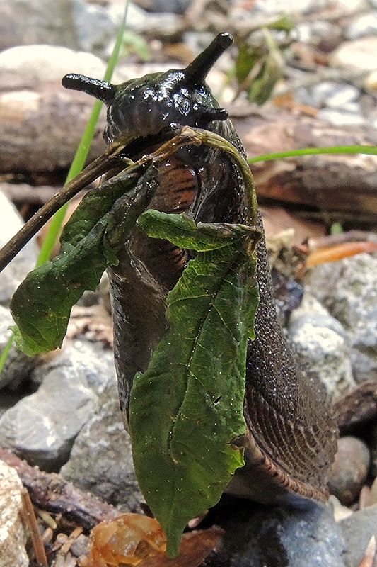 Eine Wegschnecke vertilgt eine Pflanze. Informationen zum Tier: Art: Arion spec. Rote Wegschnecke (Arion ater ruber) oder Spanische Wegschnecke (Arion vulgaris). |