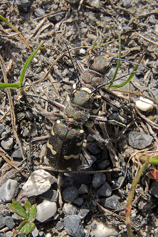 Der Dünen-Sandlaufkäfer ist relativ schwierig zu fotografieren. Er ist sehr scheu und hält permanent eine Fluchtdistanz von etwa 1 - 3 Meter ein. Die Paarung ist eine gute Gelegenheit dazu, da die Tiere in ihrer Fluchtmöglichkeit eingeschränkt sind. Informationen zum Tier: Art: Dünen-Sandlaufkäfer (Cicindela hybrida). Verbreitung: Europa, nordwärts bis in den Norden Finnlands, die Mitte Schwedens und den Süden Norwegens. Östlich erstreckt sich das Verbreitungsgebiet über Kleinasien und den Kaukasus bis nach Sibirien. Regionale Verbreitung Alpen: Vom Flachland bis in höhere Lagen. Lebensräume: Sandflächen, Flussufer, sandige Wiesen, Felder, Feldwege, sandige und lichte Wälder. Merkmale: Die Käfer werden 11 - 16 mm lang und haben eine relativ variable Körperfärbung. In der Regel sind sie grünlich-kupferfarben gefärbt, es gibt aber auch kupferbraune oder bläuliche Exemplare. Die Unterseite ist metallisch grün, die Oberlippe ist hell. Das Halsschild ist bei vielen Arten in den Farben des Regenbogens gefärbt. Die Deckflügel tragen weisse oder gelbe Zackenbinden. Der Basalfleck hat in etwa die Form eines C. Die Stirn (Frons) ist unbehaart, auch unterhalb der Facettenaugen befinden sich keine Borsten. Das erste Fühlerglied hat nur an der Spitze wenige weisse Borsten. Lebensweise: Die tagaktiven Imagines sind ab April bis in den Herbst vor allem bei starker Sonneneinstrahlung anzutreffen. Sie sind ausgezeichnete Läufer und Jäger und streifen immer wieder kurz auffliegend umher. Mit ihren sehr guten Augen können sie grössere Beute wie beispielsweise Weichkäfer ab einer Distanz von 20 - 30 cm, kleine Beute wie beispielsweise Ameisen ab etwa 10 cm wahrnehmen. Nahrung: Imagines und Larven ernähren sich von Insekten wie Ameisen, Spinnen und anderen Käfern. Paarung: Die Paarung erfolgt im späten Frühling. Ei: Das Weibchen gräbt einen wenige cm tiefen Gang in den Boden, an dessen Ende es die Eier in einer kleinen Brutkammer abgelegt. Larve: Die Larven leben in bis zu 50 cm langen Röhren, deren Eingang nach Süden zeigt. Sie bauen ihre Röhren nicht selten dicht nebeneinander. Die Entwicklungszeit dauert mehrere Jahre. Puppe: Die Verpuppung erfolgt ebenfalls in den Erdröhren. Käfer: Die Käfer bilden eine Generation pro Jahr, sie überwintern. Feinde: Frösche, Kröten, Spitzmäuse, Igel, Fledermäuse, Nagetiere, Singvögel, Spechte, aber auch Parasiten und Parasitoide. |