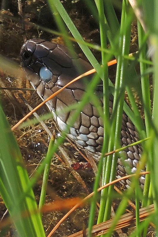 Am Auge ist sehr gut zu erkennen, dass eine Häutung bevorsteht. Informationen zum Tier: Art: Barrenringelnatter (Natrix helvetica). |