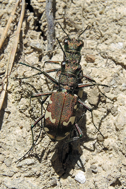 Die Paarung des Dünen-Sandlaufkäfers nimmt nicht lange Zeit in Anspruch. Informationen zum Tier: Art: Dünen-Sandlaufkäfer (Cicindela hybrida). Verbreitung: Europa, nordwärts bis in den Norden Finnlands, die Mitte Schwedens und den Süden Norwegens. Östlich erstreckt sich das Verbreitungsgebiet über Kleinasien und den Kaukasus bis nach Sibirien. Regionale Verbreitung Alpen: Vom Flachland bis in höhere Lagen. Lebensräume: Sandflächen, Flussufer, sandige Wiesen, Felder, Feldwege, sandige und lichte Wälder. Merkmale: Die Käfer werden 11 - 16 mm lang und haben eine relativ variable Körperfärbung. In der Regel sind sie grünlich-kupferfarben gefärbt, es gibt aber auch kupferbraune oder bläuliche Exemplare. Die Unterseite ist metallisch grün, die Oberlippe ist hell. Das Halsschild ist bei vielen Arten in den Farben des Regenbogens gefärbt. Die Deckflügel tragen weisse oder gelbe Zackenbinden. Der Basalfleck hat in etwa die Form eines C. Die Stirn (Frons) ist unbehaart, auch unterhalb der Facettenaugen befinden sich keine Borsten. Das erste Fühlerglied hat nur an der Spitze wenige weisse Borsten. Lebensweise: Die tagaktiven Imagines sind ab April bis in den Herbst vor allem bei starker Sonneneinstrahlung anzutreffen. Sie sind ausgezeichnete Läufer und Jäger und streifen immer wieder kurz auffliegend umher. Mit ihren sehr guten Augen können sie grössere Beute wie beispielsweise Weichkäfer ab einer Distanz von 20 - 30 cm, kleine Beute wie beispielsweise Ameisen ab etwa 10 cm wahrnehmen. Nahrung: Imagines und Larven ernähren sich von Insekten wie Ameisen, Spinnen und anderen Käfern. Paarung: Die Paarung erfolgt im späten Frühling. Ei: Das Weibchen gräbt einen wenige cm tiefen Gang in den Boden, an dessen Ende es die Eier in einer kleinen Brutkammer abgelegt. Larve: Die Larven leben in bis zu 50 cm langen Röhren, deren Eingang nach Süden zeigt. Sie bauen ihre Röhren nicht selten dicht nebeneinander. Die Entwicklungszeit dauert mehrere Jahre. Puppe: Die Verpuppung erfolgt ebenfalls in den Erdröhren. Käfer: Die Käfer bilden eine Generation pro Jahr, sie überwintern. Feinde: Frösche, Kröten, Spitzmäuse, Igel, Fledermäuse, Nagetiere, Singvögel, Spechte, aber auch Parasiten und Parasitoide. |