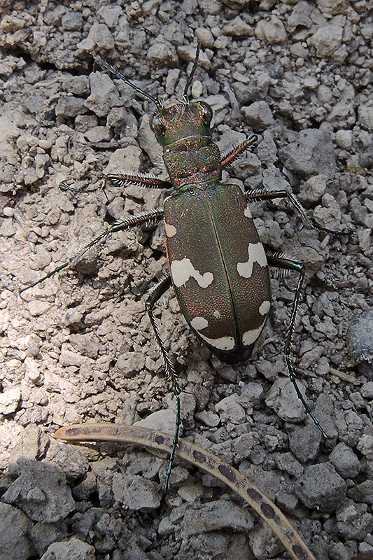 Der Dünen-Sandlaufkäfer verfügt über eine recht effiziente Tarnung. Informationen zum Tier: Art: Dünen-Sandlaufkäfer (Cicindela hybrida). Verbreitung: Europa, nordwärts bis in den Norden Finnlands, die Mitte Schwedens und den Süden Norwegens. Östlich erstreckt sich das Verbreitungsgebiet über Kleinasien und den Kaukasus bis nach Sibirien. Regionale Verbreitung Alpen: Vom Flachland bis in höhere Lagen. Lebensräume: Sandflächen, Flussufer, sandige Wiesen, Felder, Feldwege, sandige und lichte Wälder. Merkmale: Die Käfer werden 11 - 16 mm lang und haben eine relativ variable Körperfärbung. In der Regel sind sie grünlich-kupferfarben gefärbt, es gibt aber auch kupferbraune oder bläuliche Exemplare. Die Unterseite ist metallisch grün, die Oberlippe ist hell. Das Halsschild ist bei vielen Arten in den Farben des Regenbogens gefärbt. Die Deckflügel tragen weisse oder gelbe Zackenbinden. Der Basalfleck hat in etwa die Form eines C. Die Stirn (Frons) ist unbehaart, auch unterhalb der Facettenaugen befinden sich keine Borsten. Das erste Fühlerglied hat nur an der Spitze wenige weisse Borsten. Lebensweise: Die tagaktiven Imagines sind ab April bis in den Herbst vor allem bei starker Sonneneinstrahlung anzutreffen. Sie sind ausgezeichnete Läufer und Jäger und streifen immer wieder kurz auffliegend umher. Mit ihren sehr guten Augen können sie grössere Beute wie beispielsweise Weichkäfer ab einer Distanz von 20 - 30 cm, kleine Beute wie beispielsweise Ameisen ab etwa 10 cm wahrnehmen. Nahrung: Imagines und Larven ernähren sich von Insekten wie Ameisen, Spinnen und anderen Käfern. Paarung: Die Paarung erfolgt im späten Frühling. Ei: Das Weibchen gräbt einen wenige cm tiefen Gang in den Boden, an dessen Ende es die Eier in einer kleinen Brutkammer abgelegt. Larve: Die Larven leben in bis zu 50 cm langen Röhren, deren Eingang nach Süden zeigt. Sie bauen ihre Röhren nicht selten dicht nebeneinander. Die Entwicklungszeit dauert mehrere Jahre. Puppe: Die Verpuppung erfolgt ebenfalls in den Erdröhren. Käfer: Die Käfer bilden eine Generation pro Jahr, sie überwintern. Feinde: Frösche, Kröten, Spitzmäuse, Igel, Fledermäuse, Nagetiere, Singvögel, Spechte, aber auch Parasiten und Parasitoide. |