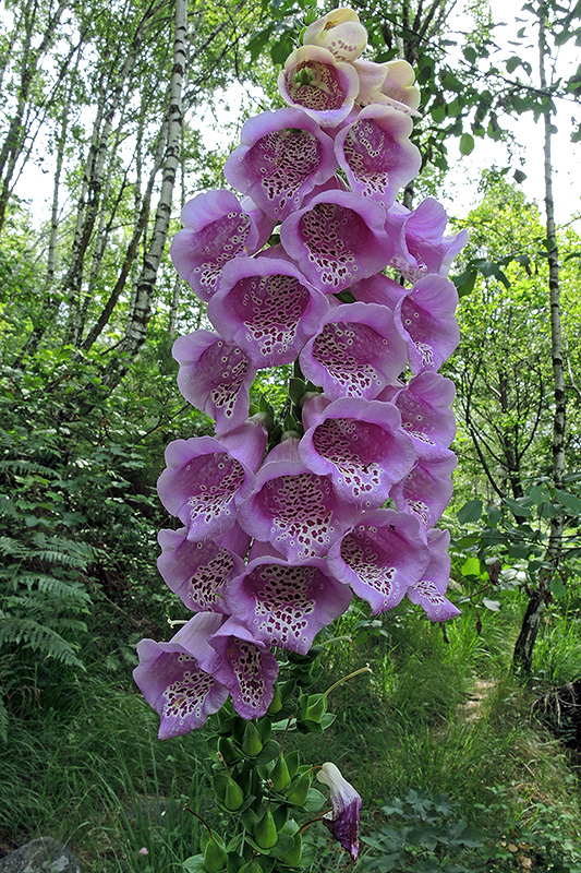 Wo der Pfad aus der Wiese kommend im verbuschten Wald verschwindet, blüht der Rote Fingerhut. Informationen zur Pflanze: Art: Roter Fingerhut (Digitalis purpurea). Verbreitung: Westeuropa, westliches Süd-, Mittel- und Nordeuropa, Marokko. In Nord- und Südamerika gebietsweise eingeschleppt. Regionale Verbreitung Alpen: In Höhen bis 1700 m, zerstreut bis selten. Vorkommen: Frische, kalkarme, saure, lockere, humusreiche, sonnige bis halbschattige Böden - lichte Wälder, Lichtungen, Holzschläge, Waldwege. Wuchshöhe: 40 bis 150 cm. Blüte: Juni - August, Blütenlänge 4 - 6 cm. |