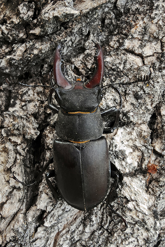 Das Tier hat den unteren Teil des rechten Vorderbeins eingebüsst. Es arbeitet sich zwar entsprechend langsam, aber dennoch erstaunlich sicher die senkrechte Rinde des Baumes hoch. Informationen zum Tier: Art: Hirschkäfer (Lucanus cervus). |