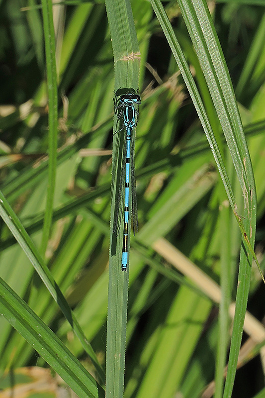 An einem Grashalm sitzt ein Männchen der Hufeisen-Azurjungfer. Informationen zum Tier: Art: Hufeisen-Azurjungfer (Coenagrion puella). Verbreitung: Europa, in Skandinavien nur im Süden, in Finnland fehlend. Nach Osten dringt sie als Unterart kocheri bis zur Mongolei und Westsibirien vor. Regionale Verbreitung Alpen: Bis in Höhen von 2300 m, im Bergland weniger häufig als in der Ebene. Lebensräume: Sie bevorzugt kleine, stehende Gewässer. Teilweise lebt sie an grösseren Gewässern, eher selten an Fliessgewässern. Merkmale: Die Körperlänge beträgt zwischen 35 und 40 mm, die Flügelspannweite bis 50 mm. Der Körper ist in der Regel sehr schlank und fast nadelförmig gebaut. Die Grundfärbung des Männchens ist leuchtend blau. Den Namen verdankt die Art dem hufeisenförmigen schwarzen Mal, das auf dem 2. Hinterleibssegment zu finden ist. Die Segmente 3-5 sind im hinteren Fünftel schwarz und haben an den Seiten schmale, schwarze Streifen. Die Segmente 6 und 7 sind schwarz oder bis auf einen kleinen vorderen Teil schwarz, während das Segment 8 hellblau ist. Die restlichen Hinterleibsegmente sind blau mit schwarzer Zeichnung. Die Grundfärbung des Weibchens ist grünlich, kann in seltenen Fällen aber auch blau sein. Der Hinterleib ist oben nahezu durchgehend schwarz gefärbt. Sie tragen auf dem ersten Abdominalsegment kein Hufeisenmal, sondern eine Zeichnung, die an einen Pokal erinnert. Weibchen lassen sich nur sicher über den Hinterrand der Vorderbrust (Prothorax) bestimmen. Junge Exemplare sind bei Männchen und Weibchen milchig blass. Lebensweise: An sonnigen Tagen besetzen die Männchen morgens ihr Territorium am Ufer des Gewässers und warten auf Weibchen. Da diese die Nacht abseits des Ufers verbracht haben, treffen sie später ein. Am späten Nachmittag verlassen die Tiere das Gewässer wieder. Nahrung: Insekten, die sie meist im Flug fängt. Ei: Bei der Paarung packen die Männchen die Weibchen mit ihren Hinterleibszangen (Cerci) unterhalb des Kopfes. Um die Befruchtung durchzuführen, bilden die beiden Libellen das sogenannte Paarungsrad. Dabei nimmt das Weibchen die Samen aus der Samentasche des Männchens. Auch die Eiablage erfolgt paarweise im Tandem. Bei dieser sitzt das Weibchen waagerecht und das Männchen ragt empor. Das Weibchen sticht die Eier mit ihrem Ovipositor in die Wasserpflanzen ein. Durch diese gemeinsame Eiablage verhindert das Männchen die Befruchtung des Weibchens durch Konkurrenten. Die abgelegten Eier benötigen zwischen 2 und 5 Wochen, um zur Larve zu werden. Larve: Die Larven schlüpfen in Mitteleuropa Ende April bis Anfang Mai. Sie leben meist in stehenden, manchmal in fliessenden Gewässern in der Unterwasservegetation bis zu einer Tiefe von maximal 2 m. Schlammige Bereiche ohne Pflanzenbewuchs werden gemieden. Die Larvalzeit dauert etwa ein Jahr, wobei die Larven überwintern. Die schlanke Larve ist blass bräunlich oder grünlich. Sie besitzt am Körperende drei Kiemenblättchen. Bei späten Larvenstadien ist die Larve etwa 15 mm lang, die Kiemenblättchen mindestens 3 mm. Diese sind zugespitzt, laufen aber nicht fadenförmig aus. Die Seitenadern zweigen schräg nach hinten ab. Seitlich sind sie bis etwa zur Mitte mit steifen Borsten besetzt. Die Fühler der Larven setzen sich aus sieben Gliedern zusammen, das Basisglied ist nicht besonders lang. Imago: Die Imagines schlüpfen ab Mai bis in den August. Zum Schlüpfen erklettern die Larven aus dem Wasser ragende Pflanzen bis in eine Höhe von 30 cm. Der Schlupf findet überwiegend am späten Vormittag statt und dauert zwischen 1 und 3½ Stunde(n). Anschliessend flattern die jungen Imagines zur Reifung in benachbarte Habitate. Die Männchen bleiben nahe dem Wasser, die Weibchen entfernen sich etwas weiter. Bei unpassendem Wetter kann der Jungfernflug aber auch erst am darauffolgenden Tag erfolgen. Die Männchen sind nach etwa 13 Tagen, die Weibchen nach 16 Tagen geschlechtsreif. Lebenserwartung: Männchen bis 39 Tage, Weibchen bis 46 Tage. Feinde: Frösche, Vögel und Hornissen. Webspinnen und Ameisen können frisch geschlüpfte Libellen attackieren und verzehren. Larven werden von Fischen gefressen. |