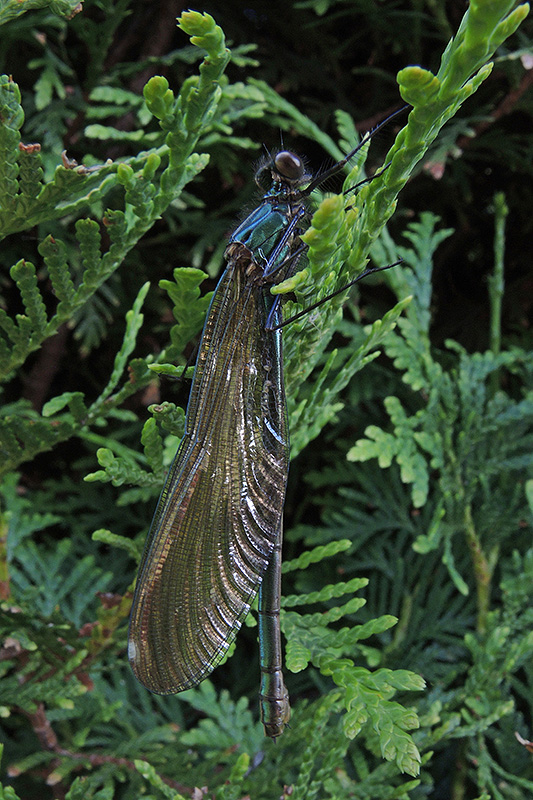 Eine Weibchen der Gebänderten Prachtlibelle sitzt auf die Morgensonne wartend in einer Tujahecke. Informationen zum Tier: Art: Gebänderte Prachtlibelle (Calopteryx splendens splendens). Verbreitung: Paläarktisch mit mehreren Unterarten vom Atlantik bis nach China, mit disjunkten Teilarealen. In Europa liegt das Verbreitungszentrum im Mittelmeerraum. Als limitierender Faktor gilt die 15 °- bzw. 16 °C-Juli-Isotherme. Regionale Verbreitung Alpen: Schwerpunktmässig in Niederungsgebieten wie Flussauen und Bachtälern. Lebensräume: Eher träge fliessende Mittel- und Unterläufe von Fliessgewässern mit hoher Besonnung und einer ausreichenden Verkrautung durch Wasser- und Uferpflanzen. Auch ähnlich strukturierte Gräben werden angenommen. Merkmale: Die Körperlänge beträgt etwa 50 mm, die Flügelspannweite zwischen 65 und 70 mm. Die Männchen haben einen schillernd dunkel-blaugrün gefärbten Körper. Die grünlich getönten, durchscheinenden Flügel weisen je eine breite, schwarzblaue Binde auf, die sowohl die Flügelbasis als auch deren Spitze auslässt. Die drei hintersten Segmente des Abdomens sind unterseits weiss. Die weniger auffälligen Weibchen sind metallisch grün bis bronzefarben und weisen grünlich getönte Flügel mit ebenso grünlichen Adern auf. Im ausgefärbten Zustand haben sie zudem ein weisses, falsches Flügelmal an jeder Flügelspitze. Lebensweise: Die Flugzeit der reifen Gebänderten Prachtlibellen dauert etwa von Mitte Mai bis Anfang September, mit einem Höhepunkt von Mitte Juni bis Anfang August. Am Fortpflanzungsgewässer sind sie nur bei Temperaturen von mindestens 16 °C aktiv. Tagsüber halten sie sich ab dem Morgen am Gewässer auf, während sie zur Nacht Ruheplätze aufsuchen. Diese liegen bei den Männchen 20 bis 40, bei den Weibchen bis zu 70 m vom Gewässer entfernt. Dabei handelt es sich um Bestände aus dichter krautiger Vegetation, etwa Röhrichte, ungemähte Wiesen oder auch Getreidefelder. Die Männchen beanspruchen entlang der Gewässer Reviere und zeigen ein ausgeprägtes Territorial- und Balzverhalten. Die Reviere sind im Mittel etwa bis 3 m lang und bis 1 m breit. Nahrung: Prachtlibellen sind Ansitzjäger. Die Larven fressen kleine Insektenlarven (Zuckmücken, Kriebelmücken, kleine Flohkrebse). Paarung: Fliegt ein Weibchen in das Territorium eines Männchens ein, beginnt dieses mit einer Balz. Es fliegt dem Weibchen mit auffälligem Schwirrflug entgegen und zeigt ihm mit hochgebogenem Abdomen sein weisses Schlusslicht. Auf diese Weise führt das Männchen das Weibchen zu einem Eiablageplatz. Dort umkreist es die Umworbene wieder mit seinem pendelnden Schwirrflug. Bleibt das Weibchen daraufhin weiter am Platz, setzt sich das Männchen auf die Flügel des Weibchens und koppelt sich mit seinen Hinterleibsanhängen in Libellenmanier bei ihm an. Es folgt die Kopulation, die im Mittel rund 2½ Minuten dauert. Danach löst sich das Paarungsrad wieder. In günstigen Revieren können pro Tag bis zu zehn Kopulationen mit verschiedenen Weibchen stattfinden. Ei: Nach einer Ruhephase beginnt das Weibchen mit der Eiablage, indem es 10 - 22 Eier pro Minute nahe der Wasseroberfläche in Wasserpflanzen einsticht. Dazu kann das Tier komplett untertauchen, wobei es dies stets mit dem Kopf voran tut. Das Männchen verteidigt derweil weiterhin sein Revier mittels drohend gespreizter Flügel und durch Anfliegen der Konkurrenten. Die Embryonalentwicklung bis zum Schlupf der Larven dauert in Mitteleuropa etwa 6 - 9 Wochen. Larve: Die Larven entwickeln sich über 10 bis 12 Stadien und werden bis zu 24 mm gross. Sie benötigen Unterwasservegetation, die in die Strömung ragt und ihnen guten Halt bietet. Typisch sind Aufenthaltsorte am Fuss von Bachröhrichten (Rohrglanzgras, Igelkolben) oder innerhalb von Beständen krautiger Tauchblattpflanzen (Wasserpest, Wasserstern, Flutender Wasserhahnenfuss). Hinsichtlich der Wassertiefe wird ein breites Spektrum von wenigen Zentimetern bis zu mehreren Dezimetern genutzt. Optimal sind im Larvalhabitat mittlere Sommertemperaturen von 16 bis 24 °C. Gegenüber Artgenossen verteidigen sie ihren Sitzplatz. Ihre Lebenszeit als Larve hängt von den Habitat- und Witterungsverhältnissen ab. In warmen Tieflandbächen und -gräben wird meist ein jährlicher Zyklus beobachtet, in kühleren Bächen eher eine zweijährige Entwicklungsdauer. Im Jahr vor der Metamorphose gehen die Larven im vorletzten oder letzten Larvenstadium in die Überwinterung. Imago: Am Ende ihrer Entwicklung erklettern die Larven Halme und andere vertikale Strukturen direkt am Gewässerufer, um sich dort in Höhen von 5 - 40 cm über der Wasserlinie zum Imago zu häuten. Dies geschieht in Mitteleuropa ab Ende April/Anfang Mai und dauert bis weit in den Juli, der Höhepunkt der Emergenz liegt zwischen Ende Mai und Mitte Juni. Der Schlupf selbst dauert etwas über eine Stunde. Die frisch geschlüpften Imagines schwärmen nach dem Aushärten in die Umgebung aus, wo sie sich auf Wiesen und an Waldrändern aufhalten und nach kleinen Insekten jagen. Innerhalb von 10 Tagen haben sie ihre Reifezeit abgeschlossen, wobei die Geschlechtsreife nach drei Tagen eintritt. Die nun ausgefärbten und erwachsenen Tiere kehren ans Schlupfgewässer zurück. Lebenserwartung: Durchschnittlich etwas über 2 Wochen. Markierte Weibchen konnten aber auch bis zu 50 Tage, Männchen maximal noch nach 69 Tagen wiedergefunden werden. Feinde: Die Larven im Wasser und zur Eiablage untertauchende Weibchen werden von Fischen und von räuberischen Insekten wie Rückenschwimmern, Wasserläufern, grösseren Libellenlarven sowie Gelbrandkäfern und deren Larven erbeutet. An Gewässern lebende Vögel wie Reiher, Störche, Eisvögel, Enten und diverse Singvögel jagen Libellenlarven. Die Imagines werden von vielen Singvögeln (Bach- und Gebirgsstelzen, Grasmücken, Schwalben), aber auch von grösseren Vogelarten sowie von Grosslibellen und Spinnen erbeutet. |