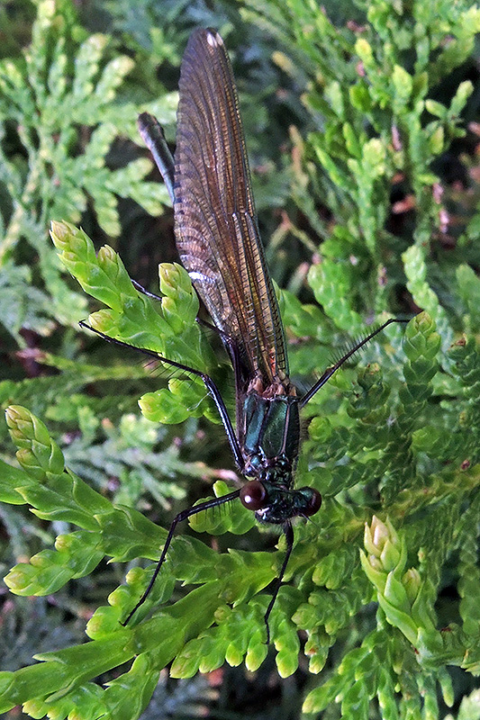 Das Tier in der Frontalansicht. Informationen zum Tier: Art: Gebänderte Prachtlibelle (Calopteryx splendens splendens). Verbreitung: Paläarktisch mit mehreren Unterarten vom Atlantik bis nach China, mit disjunkten Teilarealen. In Europa liegt das Verbreitungszentrum im Mittelmeerraum. Als limitierender Faktor gilt die 15 °- bzw. 16 °C-Juli-Isotherme. Regionale Verbreitung Alpen: Schwerpunktmässig in Niederungsgebieten wie Flussauen und Bachtälern. Lebensräume: Eher träge fliessende Mittel- und Unterläufe von Fliessgewässern mit hoher Besonnung und einer ausreichenden Verkrautung durch Wasser- und Uferpflanzen. Auch ähnlich strukturierte Gräben werden angenommen. Merkmale: Die Körperlänge beträgt etwa 50 mm, die Flügelspannweite zwischen 65 und 70 mm. Die Männchen haben einen schillernd dunkel-blaugrün gefärbten Körper. Die grünlich getönten, durchscheinenden Flügel weisen je eine breite, schwarzblaue Binde auf, die sowohl die Flügelbasis als auch deren Spitze auslässt. Die drei hintersten Segmente des Abdomens sind unterseits weiss. Die weniger auffälligen Weibchen sind metallisch grün bis bronzefarben und weisen grünlich getönte Flügel mit ebenso grünlichen Adern auf. Im ausgefärbten Zustand haben sie zudem ein weisses, falsches Flügelmal an jeder Flügelspitze. Lebensweise: Die Flugzeit der reifen Gebänderten Prachtlibellen dauert etwa von Mitte Mai bis Anfang September, mit einem Höhepunkt von Mitte Juni bis Anfang August. Am Fortpflanzungsgewässer sind sie nur bei Temperaturen von mindestens 16 °C aktiv. Tagsüber halten sie sich ab dem Morgen am Gewässer auf, während sie zur Nacht Ruheplätze aufsuchen. Diese liegen bei den Männchen 20 bis 40, bei den Weibchen bis zu 70 m vom Gewässer entfernt. Dabei handelt es sich um Bestände aus dichter krautiger Vegetation, etwa Röhrichte, ungemähte Wiesen oder auch Getreidefelder. Die Männchen beanspruchen entlang der Gewässer Reviere und zeigen ein ausgeprägtes Territorial- und Balzverhalten. Die Reviere sind im Mittel etwa bis 3 m lang und bis 1 m breit. Nahrung: Prachtlibellen sind Ansitzjäger. Die Larven fressen kleine Insektenlarven (Zuckmücken, Kriebelmücken, kleine Flohkrebse). Paarung: Fliegt ein Weibchen in das Territorium eines Männchens ein, beginnt dieses mit einer Balz. Es fliegt dem Weibchen mit auffälligem Schwirrflug entgegen und zeigt ihm mit hochgebogenem Abdomen sein weisses Schlusslicht. Auf diese Weise führt das Männchen das Weibchen zu einem Eiablageplatz. Dort umkreist es die Umworbene wieder mit seinem pendelnden Schwirrflug. Bleibt das Weibchen daraufhin weiter am Platz, setzt sich das Männchen auf die Flügel des Weibchens und koppelt sich mit seinen Hinterleibsanhängen in Libellenmanier bei ihm an. Es folgt die Kopulation, die im Mittel rund 2½ Minuten dauert. Danach löst sich das Paarungsrad wieder. In günstigen Revieren können pro Tag bis zu zehn Kopulationen mit verschiedenen Weibchen stattfinden. Ei: Nach einer Ruhephase beginnt das Weibchen mit der Eiablage, indem es 10 - 22 Eier pro Minute nahe der Wasseroberfläche in Wasserpflanzen einsticht. Dazu kann das Tier komplett untertauchen, wobei es dies stets mit dem Kopf voran tut. Das Männchen verteidigt derweil weiterhin sein Revier mittels drohend gespreizter Flügel und durch Anfliegen der Konkurrenten. Die Embryonalentwicklung bis zum Schlupf der Larven dauert in Mitteleuropa etwa 6 - 9 Wochen. Larve: Die Larven entwickeln sich über 10 bis 12 Stadien und werden bis zu 24 mm gross. Sie benötigen Unterwasservegetation, die in die Strömung ragt und ihnen guten Halt bietet. Typisch sind Aufenthaltsorte am Fuss von Bachröhrichten (Rohrglanzgras, Igelkolben) oder innerhalb von Beständen krautiger Tauchblattpflanzen (Wasserpest, Wasserstern, Flutender Wasserhahnenfuss). Hinsichtlich der Wassertiefe wird ein breites Spektrum von wenigen Zentimetern bis zu mehreren Dezimetern genutzt. Optimal sind im Larvalhabitat mittlere Sommertemperaturen von 16 bis 24 °C. Gegenüber Artgenossen verteidigen sie ihren Sitzplatz. Ihre Lebenszeit als Larve hängt von den Habitat- und Witterungsverhältnissen ab. In warmen Tieflandbächen und -gräben wird meist ein jährlicher Zyklus beobachtet, in kühleren Bächen eher eine zweijährige Entwicklungsdauer. Im Jahr vor der Metamorphose gehen die Larven im vorletzten oder letzten Larvenstadium in die Überwinterung. Imago: Am Ende ihrer Entwicklung erklettern die Larven Halme und andere vertikale Strukturen direkt am Gewässerufer, um sich dort in Höhen von 5 - 40 cm über der Wasserlinie zum Imago zu häuten. Dies geschieht in Mitteleuropa ab Ende April/Anfang Mai und dauert bis weit in den Juli, der Höhepunkt der Emergenz liegt zwischen Ende Mai und Mitte Juni. Der Schlupf selbst dauert etwas über eine Stunde. Die frisch geschlüpften Imagines schwärmen nach dem Aushärten in die Umgebung aus, wo sie sich auf Wiesen und an Waldrändern aufhalten und nach kleinen Insekten jagen. Innerhalb von 10 Tagen haben sie ihre Reifezeit abgeschlossen, wobei die Geschlechtsreife nach drei Tagen eintritt. Die nun ausgefärbten und erwachsenen Tiere kehren ans Schlupfgewässer zurück. Lebenserwartung: Durchschnittlich etwas über 2 Wochen. Markierte Weibchen konnten aber auch bis zu 50 Tage, Männchen maximal noch nach 69 Tagen wiedergefunden werden. Feinde: Die Larven im Wasser und zur Eiablage untertauchende Weibchen werden von Fischen und von räuberischen Insekten wie Rückenschwimmern, Wasserläufern, grösseren Libellenlarven sowie Gelbrandkäfern und deren Larven erbeutet. An Gewässern lebende Vögel wie Reiher, Störche, Eisvögel, Enten und diverse Singvögel jagen Libellenlarven. Die Imagines werden von vielen Singvögeln (Bach- und Gebirgsstelzen, Grasmücken, Schwalben), aber auch von grösseren Vogelarten sowie von Grosslibellen und Spinnen erbeutet. |