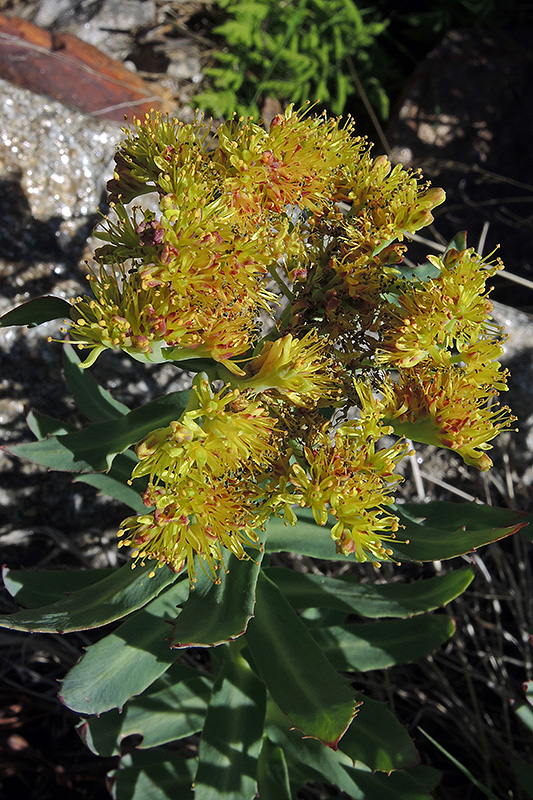 Der Rosenwurz ist zweihäusig getrenntgeschlechtig, es gibt männliche und weibliche Exemplare. Die Blüten stehen in dichten, bündeligen Blütenständen zusammen. Die 1½ bis 2½ mm langen, freien Kronblätter sind bei den weiblichen Blüten gelb, im Verblühen rot-orangefarbenen und bei den männlichen Blüten purpurfarben. |
