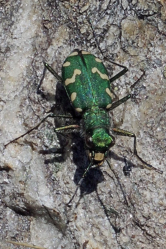 Nahe der Staumauer streift ein Gallischer Sandlaufkäfer auf dem Pfad umher. Informationen zum Tier: Art: Gallischer Sandlaufkäfer (Cicindela gallica). Verbreitung: Gesamter Alpenraum. Regionale Verbreitung Alpen: In Höhen zwischen 1500 und 2800 m, mit Schwerpunkt in den Westalpen, in den Ostalpen nur stellenweise und selten. Lebensräume: Sonnige Stellen alpiner Matten und offener Erosionsflächen oberhalb der Waldgrenze bis unterhalb der Schneefelder. Merkmale: Die Käfer weisen eine Körperlänge von 11 - 15 mm auf. Die Deckflügel sind leuchtend grün gefärbt und haben weisse Zackenbinden. Selten sind sie dunkler, bläulich oder schwach kupfrig überflogen. Der Apikalmakel an der Spitze der Deckflügel besteht in der Regel aus zwei einzelnen Flecken. Das erste Fühlerglied ist komplett weiss behaart. Die Labialpalpen sind komplett metallisch dunkel gefärbt. Die Stirn weist keine Behaarung auf. Lebensweise: Die gut entwickelten, grossen Augen und die langen, schlanken Beine weisen die tagaktiven Tiere als Jäger aus. Nahrung: Larve wie Imago leben räuberisch, sie fressen kleinere Insekten und Spinnen. Paarung: Zur Paarung liegen keine Erkenntnisse vor. Ei: Zum Eistadium liegen keine Erkenntnisse vor. Larve: Die Larve entwickelt sich in selbstgegrabenen, senkrechten Erdröhren und wartet dort auf vorbeilaufende Beutetiere. Sie überwintert. Puppe: Zum Puppenstadium liegen keine Erkenntnisse vor. Käfer: Die Art ist gut an Kälte angepasst und kann deswegen an sonnigen Hängen noch Ende Oktober und nach der Überwinterung schon Anfang Juni angetroffen werden. Feinde: Frösche, Kröten, Spitzmäuse, Igel, Fledermäuse, Nagetiere, Singvögel, Spechte, aber auch Parasiten und Parasitoide. |