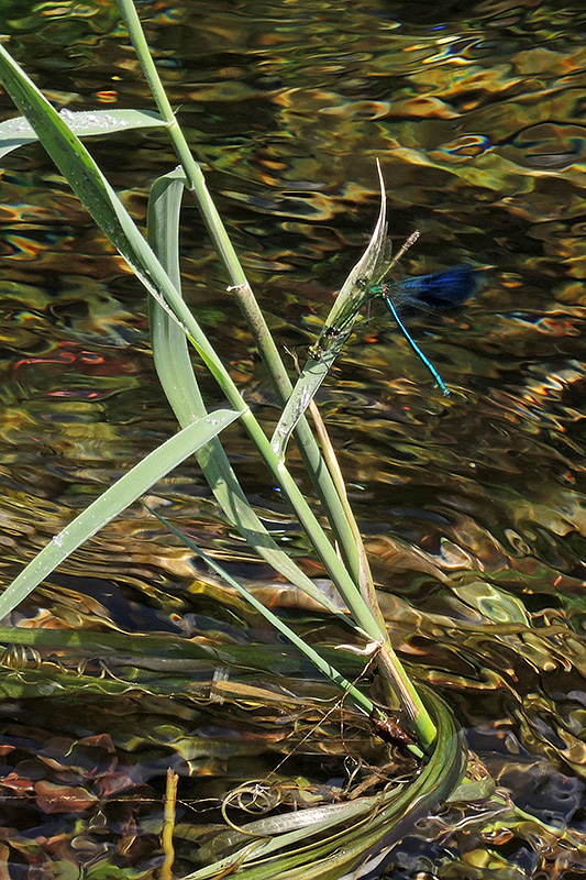 Zur Einleitung der Paarung setzt sich das Männchen auf die Flügel des Weibchens. Informationen zum Tier: Art: Gebänderte Prachtlibelle (Calopteryx splendens splendens). Verbreitung: Paläarktisch mit mehreren Unterarten vom Atlantik bis nach China, mit disjunkten Teilarealen. In Europa liegt das Verbreitungszentrum im Mittelmeerraum. Als limitierender Faktor gilt die 15 °- bzw. 16 °C-Juli-Isotherme. Regionale Verbreitung Alpen: Schwerpunktmässig in Niederungsgebieten wie Flussauen und Bachtälern. Lebensräume: Eher träge fliessende Mittel- und Unterläufe von Fliessgewässern mit hoher Besonnung und einer ausreichenden Verkrautung durch Wasser- und Uferpflanzen. Auch ähnlich strukturierte Gräben werden angenommen. Merkmale: Die Körperlänge beträgt etwa 50 mm, die Flügelspannweite zwischen 65 und 70 mm. Die Männchen haben einen schillernd dunkel-blaugrün gefärbten Körper. Die grünlich getönten, durchscheinenden Flügel weisen je eine breite, schwarzblaue Binde auf, die sowohl die Flügelbasis als auch deren Spitze auslässt. Die drei hintersten Segmente des Abdomens sind unterseits weiss. Die weniger auffälligen Weibchen sind metallisch grün bis bronzefarben und weisen grünlich getönte Flügel mit ebenso grünlichen Adern auf. Im ausgefärbten Zustand haben sie zudem ein weisses, falsches Flügelmal an jeder Flügelspitze. Lebensweise: Die Flugzeit der reifen Gebänderten Prachtlibellen dauert etwa von Mitte Mai bis Anfang September, mit einem Höhepunkt von Mitte Juni bis Anfang August. Am Fortpflanzungsgewässer sind sie nur bei Temperaturen von mindestens 16 °C aktiv. Tagsüber halten sie sich ab dem Morgen am Gewässer auf, während sie zur Nacht Ruheplätze aufsuchen. Diese liegen bei den Männchen 20 bis 40, bei den Weibchen bis zu 70 m vom Gewässer entfernt. Dabei handelt es sich um Bestände aus dichter krautiger Vegetation, etwa Röhrichte, ungemähte Wiesen oder auch Getreidefelder. Die Männchen beanspruchen entlang der Gewässer Reviere und zeigen ein ausgeprägtes Territorial- und Balzverhalten. Die Reviere sind im Mittel etwa bis 3 m lang und bis 1 m breit. Nahrung: Prachtlibellen sind Ansitzjäger. Die Larven fressen kleine Insektenlarven (Zuckmücken, Kriebelmücken, kleine Flohkrebse). Paarung: Fliegt ein Weibchen in das Territorium eines Männchens ein, beginnt dieses mit einer Balz. Es fliegt dem Weibchen mit auffälligem Schwirrflug entgegen und zeigt ihm mit hochgebogenem Abdomen sein weisses Schlusslicht. Auf diese Weise führt das Männchen das Weibchen zu einem Eiablageplatz. Dort umkreist es die Umworbene wieder mit seinem pendelnden Schwirrflug. Bleibt das Weibchen daraufhin weiter am Platz, setzt sich das Männchen auf die Flügel des Weibchens und koppelt sich mit seinen Hinterleibsanhängen in Libellenmanier bei ihm an. Es folgt die Kopulation, die im Mittel rund 2½ Minuten dauert. Danach löst sich das Paarungsrad wieder. In günstigen Revieren können pro Tag bis zu zehn Kopulationen mit verschiedenen Weibchen stattfinden. Ei: Nach einer Ruhephase beginnt das Weibchen mit der Eiablage, indem es 10 - 22 Eier pro Minute nahe der Wasseroberfläche in Wasserpflanzen einsticht. Dazu kann das Tier komplett untertauchen, wobei es dies stets mit dem Kopf voran tut. Das Männchen verteidigt derweil weiterhin sein Revier mittels drohend gespreizter Flügel und durch Anfliegen der Konkurrenten. Die Embryonalentwicklung bis zum Schlupf der Larven dauert in Mitteleuropa etwa 6 - 9 Wochen. Larve: Die Larven entwickeln sich über 10 bis 12 Stadien und werden bis zu 24 mm gross. Sie benötigen Unterwasservegetation, die in die Strömung ragt und ihnen guten Halt bietet. Typisch sind Aufenthaltsorte am Fuss von Bachröhrichten (Rohrglanzgras, Igelkolben) oder innerhalb von Beständen krautiger Tauchblattpflanzen (Wasserpest, Wasserstern, Flutender Wasserhahnenfuss). Hinsichtlich der Wassertiefe wird ein breites Spektrum von wenigen Zentimetern bis zu mehreren Dezimetern genutzt. Optimal sind im Larvalhabitat mittlere Sommertemperaturen von 16 bis 24 °C. Gegenüber Artgenossen verteidigen sie ihren Sitzplatz. Ihre Lebenszeit als Larve hängt von den Habitat- und Witterungsverhältnissen ab. In warmen Tieflandbächen und -gräben wird meist ein jährlicher Zyklus beobachtet, in kühleren Bächen eher eine zweijährige Entwicklungsdauer. Im Jahr vor der Metamorphose gehen die Larven im vorletzten oder letzten Larvenstadium in die Überwinterung. Imago: Am Ende ihrer Entwicklung erklettern die Larven Halme und andere vertikale Strukturen direkt am Gewässerufer, um sich dort in Höhen von 5 - 40 cm über der Wasserlinie zum Imago zu häuten. Dies geschieht in Mitteleuropa ab Ende April/Anfang Mai und dauert bis weit in den Juli, der Höhepunkt der Emergenz liegt zwischen Ende Mai und Mitte Juni. Der Schlupf selbst dauert etwas über eine Stunde. Die frisch geschlüpften Imagines schwärmen nach dem Aushärten in die Umgebung aus, wo sie sich auf Wiesen und an Waldrändern aufhalten und nach kleinen Insekten jagen. Innerhalb von 10 Tagen haben sie ihre Reifezeit abgeschlossen, wobei die Geschlechtsreife nach drei Tagen eintritt. Die nun ausgefärbten und erwachsenen Tiere kehren ans Schlupfgewässer zurück. Lebenserwartung: Durchschnittlich etwas über 2 Wochen. Markierte Weibchen konnten aber auch bis zu 50 Tage, Männchen maximal noch nach 69 Tagen wiedergefunden werden. Feinde: Die Larven im Wasser und zur Eiablage untertauchende Weibchen werden von Fischen und von räuberischen Insekten wie Rückenschwimmern, Wasserläufern, grösseren Libellenlarven sowie Gelbrandkäfern und deren Larven erbeutet. An Gewässern lebende Vögel wie Reiher, Störche, Eisvögel, Enten und diverse Singvögel jagen Libellenlarven. Die Imagines werden von vielen Singvögeln (Bach- und Gebirgsstelzen, Grasmücken, Schwalben), aber auch von grösseren Vogelarten sowie von Grosslibellen und Spinnen erbeutet. |