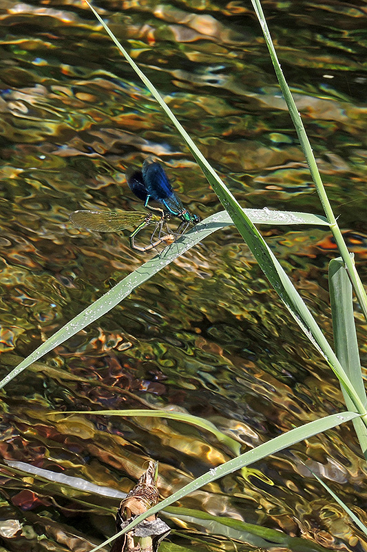 Das Weibchen vollendet daraufhin das Paarungsrad. Informationen zum Tier: Art: Gebänderte Prachtlibelle (Calopteryx splendens splendens). Verbreitung: Paläarktisch mit mehreren Unterarten vom Atlantik bis nach China, mit disjunkten Teilarealen. In Europa liegt das Verbreitungszentrum im Mittelmeerraum. Als limitierender Faktor gilt die 15 °- bzw. 16 °C-Juli-Isotherme. Regionale Verbreitung Alpen: Schwerpunktmässig in Niederungsgebieten wie Flussauen und Bachtälern. Lebensräume: Eher träge fliessende Mittel- und Unterläufe von Fliessgewässern mit hoher Besonnung und einer ausreichenden Verkrautung durch Wasser- und Uferpflanzen. Auch ähnlich strukturierte Gräben werden angenommen. Merkmale: Die Körperlänge beträgt etwa 50 mm, die Flügelspannweite zwischen 65 und 70 mm. Die Männchen haben einen schillernd dunkel-blaugrün gefärbten Körper. Die grünlich getönten, durchscheinenden Flügel weisen je eine breite, schwarzblaue Binde auf, die sowohl die Flügelbasis als auch deren Spitze auslässt. Die drei hintersten Segmente des Abdomens sind unterseits weiss. Die weniger auffälligen Weibchen sind metallisch grün bis bronzefarben und weisen grünlich getönte Flügel mit ebenso grünlichen Adern auf. Im ausgefärbten Zustand haben sie zudem ein weisses, falsches Flügelmal an jeder Flügelspitze. Lebensweise: Die Flugzeit der reifen Gebänderten Prachtlibellen dauert etwa von Mitte Mai bis Anfang September, mit einem Höhepunkt von Mitte Juni bis Anfang August. Am Fortpflanzungsgewässer sind sie nur bei Temperaturen von mindestens 16 °C aktiv. Tagsüber halten sie sich ab dem Morgen am Gewässer auf, während sie zur Nacht Ruheplätze aufsuchen. Diese liegen bei den Männchen 20 bis 40, bei den Weibchen bis zu 70 m vom Gewässer entfernt. Dabei handelt es sich um Bestände aus dichter krautiger Vegetation, etwa Röhrichte, ungemähte Wiesen oder auch Getreidefelder. Die Männchen beanspruchen entlang der Gewässer Reviere und zeigen ein ausgeprägtes Territorial- und Balzverhalten. Die Reviere sind im Mittel etwa bis 3 m lang und bis 1 m breit. Nahrung: Prachtlibellen sind Ansitzjäger. Die Larven fressen kleine Insektenlarven (Zuckmücken, Kriebelmücken, kleine Flohkrebse). Paarung: Fliegt ein Weibchen in das Territorium eines Männchens ein, beginnt dieses mit einer Balz. Es fliegt dem Weibchen mit auffälligem Schwirrflug entgegen und zeigt ihm mit hochgebogenem Abdomen sein weisses Schlusslicht. Auf diese Weise führt das Männchen das Weibchen zu einem Eiablageplatz. Dort umkreist es die Umworbene wieder mit seinem pendelnden Schwirrflug. Bleibt das Weibchen daraufhin weiter am Platz, setzt sich das Männchen auf die Flügel des Weibchens und koppelt sich mit seinen Hinterleibsanhängen in Libellenmanier bei ihm an. Es folgt die Kopulation, die im Mittel rund 2½ Minuten dauert. Danach löst sich das Paarungsrad wieder. In günstigen Revieren können pro Tag bis zu zehn Kopulationen mit verschiedenen Weibchen stattfinden. Ei: Nach einer Ruhephase beginnt das Weibchen mit der Eiablage, indem es 10 - 22 Eier pro Minute nahe der Wasseroberfläche in Wasserpflanzen einsticht. Dazu kann das Tier komplett untertauchen, wobei es dies stets mit dem Kopf voran tut. Das Männchen verteidigt derweil weiterhin sein Revier mittels drohend gespreizter Flügel und durch Anfliegen der Konkurrenten. Die Embryonalentwicklung bis zum Schlupf der Larven dauert in Mitteleuropa etwa 6 - 9 Wochen. Larve: Die Larven entwickeln sich über 10 bis 12 Stadien und werden bis zu 24 mm gross. Sie benötigen Unterwasservegetation, die in die Strömung ragt und ihnen guten Halt bietet. Typisch sind Aufenthaltsorte am Fuss von Bachröhrichten (Rohrglanzgras, Igelkolben) oder innerhalb von Beständen krautiger Tauchblattpflanzen (Wasserpest, Wasserstern, Flutender Wasserhahnenfuss). Hinsichtlich der Wassertiefe wird ein breites Spektrum von wenigen Zentimetern bis zu mehreren Dezimetern genutzt. Optimal sind im Larvalhabitat mittlere Sommertemperaturen von 16 bis 24 °C. Gegenüber Artgenossen verteidigen sie ihren Sitzplatz. Ihre Lebenszeit als Larve hängt von den Habitat- und Witterungsverhältnissen ab. In warmen Tieflandbächen und -gräben wird meist ein jährlicher Zyklus beobachtet, in kühleren Bächen eher eine zweijährige Entwicklungsdauer. Im Jahr vor der Metamorphose gehen die Larven im vorletzten oder letzten Larvenstadium in die Überwinterung. Imago: Am Ende ihrer Entwicklung erklettern die Larven Halme und andere vertikale Strukturen direkt am Gewässerufer, um sich dort in Höhen von 5 - 40 cm über der Wasserlinie zum Imago zu häuten. Dies geschieht in Mitteleuropa ab Ende April/Anfang Mai und dauert bis weit in den Juli, der Höhepunkt der Emergenz liegt zwischen Ende Mai und Mitte Juni. Der Schlupf selbst dauert etwas über eine Stunde. Die frisch geschlüpften Imagines schwärmen nach dem Aushärten in die Umgebung aus, wo sie sich auf Wiesen und an Waldrändern aufhalten und nach kleinen Insekten jagen. Innerhalb von 10 Tagen haben sie ihre Reifezeit abgeschlossen, wobei die Geschlechtsreife nach drei Tagen eintritt. Die nun ausgefärbten und erwachsenen Tiere kehren ans Schlupfgewässer zurück. Lebenserwartung: Durchschnittlich etwas über 2 Wochen. Markierte Weibchen konnten aber auch bis zu 50 Tage, Männchen maximal noch nach 69 Tagen wiedergefunden werden. Feinde: Die Larven im Wasser und zur Eiablage untertauchende Weibchen werden von Fischen und von räuberischen Insekten wie Rückenschwimmern, Wasserläufern, grösseren Libellenlarven sowie Gelbrandkäfern und deren Larven erbeutet. An Gewässern lebende Vögel wie Reiher, Störche, Eisvögel, Enten und diverse Singvögel jagen Libellenlarven. Die Imagines werden von vielen Singvögeln (Bach- und Gebirgsstelzen, Grasmücken, Schwalben), aber auch von grösseren Vogelarten sowie von Grosslibellen und Spinnen erbeutet. |
