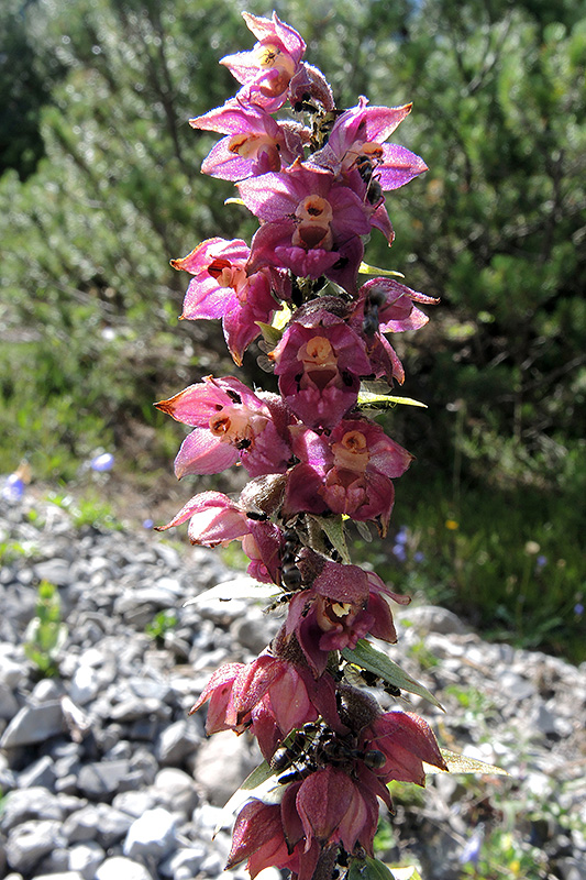 Jede Menge Ameisen tummeln sich auf den Blütenständen. Informationen zur Pflanze: Art: Braunrote Stendelwurz (Epipactis atrorubens). Verbreitung: In Europa weit verbreitet, im Norden bis an die boreale, im Süden an die meridionale Zone, Richtung Osten bis Zentralsibirien und zum Kaukasus. Regionale Verbreitung Alpen: In Höhen bis 2600 m, zerstreut. Vorkommen: Kalkreiche, basisch bis neutrale, nährstoffarme, durchlässige, trockenwarme Sand- und Steinböden - helle Misch- und Nadelwälder, Säume, lichte Gebüsche, Brachland, Bahndämme, Halden, Zwergstrauchheiden von Dünen. Wuchshöhe: 20 - 80 cm. Blüte: Juni - August, Sepalen Länge 8 - 10 mm, Breite 3,5 - 5 mm, Petalen etwas kürzer und breiter, Hypochil Länge 4 - 6 mm. |
