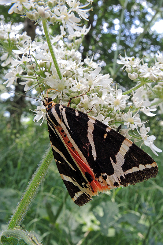 Ein Russischer Bär saugt Nektar. Informationen zum Tier: Art: Russischer Bär (Euplagia quadripunctaria). Verbreitung: Eurasiatisch, von der Iberischen Halbinsel bis Russland und Vorderasien, nördlich bis zum Baltikum. Regionale Verbreitung Alpen: Kollin-montan, bis in Höhen von etwa 2000 m. Lebensräume: Felsiges, kalkiges Gelände wie Steinbrüche, Fluss- und Bachränder, Trockenrasen, felsige Täler oder Hänge. Sie sind in sonnigem, trockenem wie auch in feuchtem, halbschattigem Gelände zu finden. Merkmale: Die Falter erreichen eine Flügelspannweite von 42 - 52 mm. Sie haben schwarzblaue Vorderflügel mit weissen oder gelblichen Streifen. Diese bilden an den Flügelspitzen ein markantes 'V'. Die orangen Hinterflügel weisen 3 - 4 schwarze Flecken auf. Im Gegensatz zu anderen Bärenspinnern besitzen sie einen gut ausgebildeten Saugrüssel, der es ihnen ermöglicht, Nektar von Blüten zu saugen. Ei: Die Paarung erfolgt im Hochsommer. Die Weibchen legen anschliessend ihre Eier locker nebeneinander unter die Blätter der Futterpflanzen. Sie sind von gelblichgrüner Farbe, rundlich, mit abgeflachter Basis. Nach etwa 2 Wochen schlüpfen die jungen Raupen. Raupe: Die ausgewachsenen Raupen erreichen eine Länge von 50 mm. Sie sind schwarzgrau und haben eine gelbe Rückenlinie. Seitlich sind kleine weisse und gelbe Flecken vorhanden. Die Warzen sind blaugrau, gelblich und schwärzlich gemischt und weisen kurze, helle Borsten auf. Sie schlüpfen im September und überwintern in der unteren Krautschicht ihres Lebensraums. Sie sind polyphag, fressen also Blätter einer Vielzahl verschiedener Pflanzen wie Taubnessel (Lamium spec.), Grosse Brennnessel (Urtica dioica), Kleiner Wiesenknopf (Sanguisorba minor), Natternkopf (Echium vulgare), Hasel (Corylus spec.), Himbeere (Rubus idaeus), Echte Brombeere (Rubus fruticosus), Wiesensalbei (Salvia pratensis) oder Fuchssches Greiskraut (Senecio fuchsii). Junge Raupen fressen vor allem Kräuter, ältere fressen auch am Laub holziger Gewächse. Puppe: Die Verpuppung erfolgt im Juni des folgenden Jahres in einem weichen, weissgrauen Gespinst zwischen Blättern nahe dem Boden. Die Puppe ist glänzend rotbraun. Am Kremaster findet sich ein Büschel gelber Borsten. Nach etwa einem Monat schlüpfen die Falter. Falter: Die Falter sind tag- und nachtaktiv. Sie fliegen in einer Generation von Juli bis September. Sie sind nicht häufig, aber in manchen Jahren lokal zahlreich. Sie saugen bevorzugt an Blüten des Wasserdostes (Eupatorium cannabinum). |