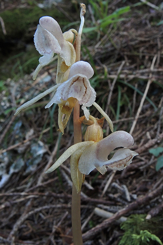 Zwei bis acht Blüten bilden eine lockere Traube. Informationen zur Pflanze: Art: Widerbart (Epipogium aphyllum). Verbreitung: Europa und Vorderasien mit Ausnahme der mediterranen Gebiete, ostwärts bis Sibirien, Japan, Halbinsel Kamtschatka und Himalaya. Regionale Verbreitung Alpen: In Höhen bis gegen 1500 m, zerstreut, selten. Vorkommen: Gut durchfeuchtete, nährstoffreiche Mullböden - moosreiche, schattige Laub- und Nadelwälder mit Totholz. Wuchshöhe: 10 - 30 cm. Blüte: Mitte Juli - Mitte August, Länge Blütenhüllblätter 10 - 15 mm, Lippe 5 - 10 mm. |