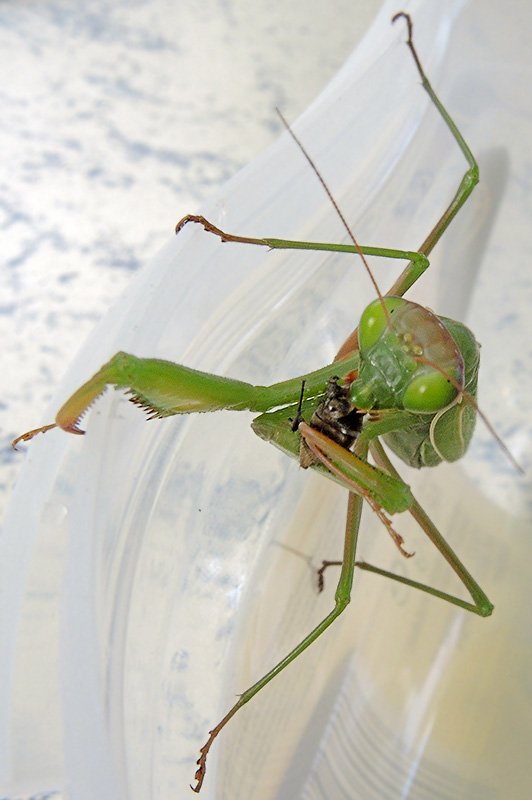 Eine Gottesanbeterin beim Fressen einer Fliege. Die Beute ist innert weniger Minuten verschlungen. Informationen zum Tier: Art: Europäische Gottesanbeterin (Mantis religiosa). |