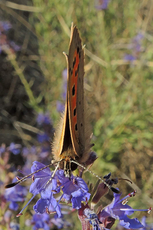 Ein Kleiner Feuerfalter in der Frontalansicht. Informationen zum Tier: Art: Kleiner Feuerfalter (Lycaena phlaeas). Verbreitung: Vom Nordosten Nordamerikas über ganz Europa und Nordafrika bis in die gemässigten Breiten Asiens und Japans. Regionale Verbreitung Alpen: Bis in Höhen von 2000 m. Lebensräume: Vor allem locker bewachsene, offene, blumenreiche Biotope, häufig. In Gebieten mit Kalk sind sie eher selten vertreten. Merkmale: Die Falter erreichen eine Flügelspannweite von 22 - 27 mm. Beide Geschlechter sind gleich gefärbt. Ihre Vorderflügeloberseiten sind orangerot und haben einen breiten, dunkelbraunen Außenrand (Saumbinde). Nahe diesem Rand sind mehrere dunkle Würfelflecken erkennbar. Die Hinterflügel sind dunkelbraun gefärbt und haben eine orangefarbene Binde knapp am Aussenrand. Der Rand selber ist gewellt braun gefärbt und gleich den Vorderflügeln hell gefranst. Die Unterseite der Vorderflügel ist ähnlich wie die Oberseite gefärbt, an die Stelle des Brauns tritt jedoch ein Graubraun und ihre Färbung ist matter. Die Unterseite der Hinterflügel ist braungrau, hat kleine, schwarze Punkte und nahe dem Außenrand eine feine, orange gepunktete Binde. Ei: Die Weibchen legen ihre sehr kleinen, weißlichgrauen Eier auf den Blattunterseiten der Futterpflanzen ab. Raupe: Die Raupen werden bis 15 mm lang. Sie sind meist grün gefärbt, manchmal aber auch rötlich mit einer roten Rückenlinie und ähnlich gefärbten Substigmatallinien. Diese können aber auch fehlen. Der Raupenkopf ist bräunlichgrün und in den Körper zurückgezogen. Sie ernähren sich in Mitteleuropa hauptsächlich vom Kleinen Sauerampfer (Rumex acetosella), aber auch vom Wiesen-Sauerampfer (Rumex acetosa). Selten findet man sie auf dem Stumpfblättrigen Ampfer (Rumex obtusifolius). In Gebieten, in denen die Ampferpflanzen fehlen, weichen sie auf Vogelknöteriche (Polygonum spec.) aus. Die Raupen fressen an der Blattunterseite. Die Überwinterung der letzten Generation erfolgt als junge Raupe, seltener als ältere. Puppe: Die Verpuppung erfolgt am Boden zwischen versponnenen Blättern der Futterpflanzen in einer hellbraunen, schwarz gepunkteten Puppe. Die Falter schlüpfen nach etwa vier Wochen. Falter: Die Falter fliegen in 3 bis 4 nicht gut trennbaren Generationen je nach Region von Februar/April bis Ende Oktober. Die vierte Generation wird in Mitteleuropa meist durch Frost getötet, ohne dass sie sich fortgepflanzt hat. In Nordeuropa fliegen sie in 2 Generationen von Mai bis Anfang Oktober. Das Männchen verteidigt sein Territorium gegen andere Männchen und verjagt auch deutlich grössere Falter. |